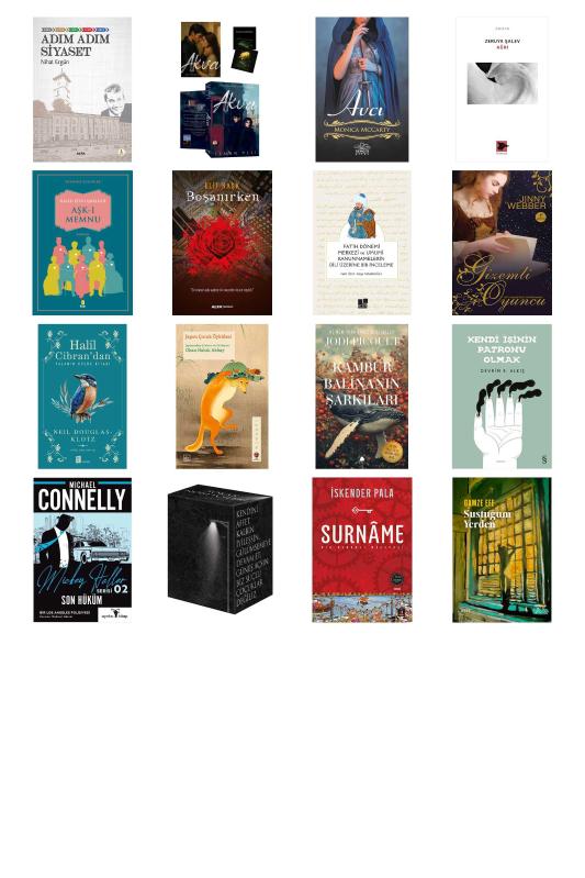 Adım Adım Siyaset - Akva - Avcı - Ağrı - Aşk-ı Memnu - Boşanırken - Fatih Dönemi Merkezî ve Umumî Kanunnamelerin Dili Üzerine Bir İnceleme - Gizemli Oyuncu - Halil Cibran’dan Yaşamın Küçük Kitabı - Japon Çocuk Öyküleri - Kambur Balinanın Şarkıları - Kendi İşinin Patronu Olmak - Mickey Haller Serisi 2 - Son Hüküm - Sokak Nöbetçileri Seti - 4 Kitap (Kutulu - Ciltli) - Surnâme - Bir Osmanlı Mâcerası - Sustuğum Yerden