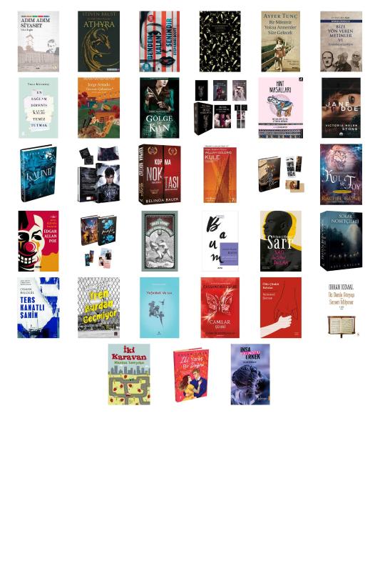 Adım Adım Siyaset - Athyra - Benden Kalan Senindir - Beyaz Zambaklar Ülkesinde (Ciltli) - Bir Maniniz Yoksa Annemler Size Gelecek - Bize Yön Veren Metinler 6 - En Sağlam Direniş Kalbi Temiz Tutmak - Gecenin Çobanları - Gölge ve Kan - Hepimiz Gökyüzü Olmak İstedik 3 - Deliler ve Cellatlar (Kutulu - Ciltli) - Hint Masalları - Jane Doe - Kalıntı 2 (Ciltli) - Kaybolmuş Ruhlar Sarayı - Senteria’nın Varisi (Ciltli) - Kopma Noktası - Kule - Kutlu Olsun 2 (Ciltli) - Kül ve Tüy - Kızıl Ölümün Maskesi - Mahi - 2 (Ciltli) - On Beş Yaşında Bir Kaptan - Oz Büyücüsü - Safi İnsan Onlar - Sokak Nöbetçileri - 2 - Ters Kanatlı Şahin - Tren Burdan Geçmiyor - Yaşamak ve Sen - Ölümcül Oyuncaklar 3. Kitap - Camlar Şehri - Ölür Çünkü Babalar - İki Damla Gözyaşı - Serseri Milyoner - İki Karavan - İki Yanlış Bir Doğru (Ciltli) - İnşa Halindeki Erkek
