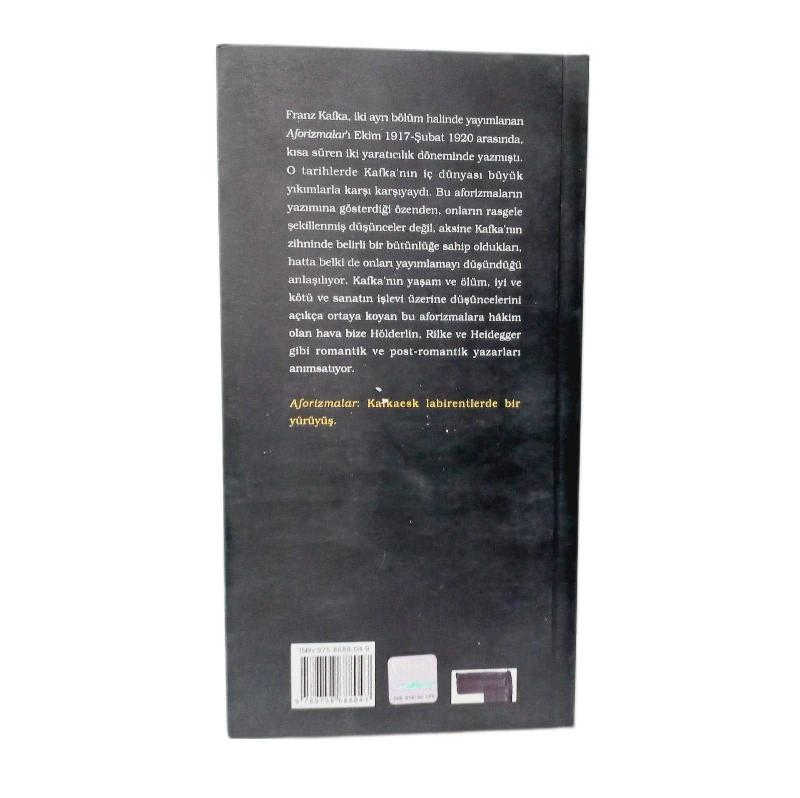 '0' MAĞAZA ÜRÜNÜDÜR. YIRTIK ÇİZİK VB KUSURU YOKTUR. Aforizmalar Franz Kafka BORDO SİYAH İki ayrı bölüm halinde yayımlanan Aforizmalar'ı Franz Kafka, Ekim 1917 ile Şubat 1920 arasında, kısa süren iki yaratıcılık döneminde yazmıştı. O tarihlerde Kafka'nın iç dünyası büyük yıkımlarla karşı karşıyaydı. Bu aforizmaların yazımına gösterdiği özenden, onların rasgele şekillenmiş düşünceler değil, aksine Kafka'nın zihninde belirli bir bütünlüğe sahip oldukları ve hatta belki de onları yayımlamayı düşündüğü anlaşılıyor. Kafka'nın yaşam ve ölüm, iyi ve kötü, ve sanatın işlevi üzerine düşüncelerini açıkça ortaya koyan bu aforizmalara hâkim olan hava bize Hölderlin, Rilke ve Heidegger gibi romantik ve post-romantik yazarları anımsatıyor. Çevirmen: Osman Çakmakçı Yayın Tarihi:2004 Orijinal Adı: Aforizma ISBN: 9789758688043 Dil: TÜRKÇE Sayfa Sayısı: 100 Cilt Tipi: Karton Kapak Kağıt Cinsi: Kitap Kağıdı Boyut: 11 x 21 cm