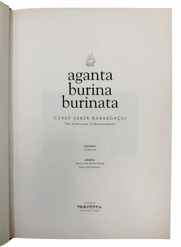 Özgün karton kapağında, çok temiz durumda, 16 x 23.5 cm, İngilizce, 280 sayfa. 1946 yılında yayımlanan Aganta Burina Burinata romanı, Halikarnas Balıkçısı‘nın eserlerinin genel özelliklerini yansıtır. Romanda, deniz sevgisi, denizin çekiciliği, denizcilerin yaşadığı zorluklar, güzellikler genel olarak denizdeki yaşam bir kahraman vasıtasıyla anlatılmaktadır. Eserde, deniz bir başkahraman gibi işlenmiş, bu yüzden yayımlandığı zaman çok ilgi görmüştür. Anı biçiminde yazılmıştır. Bir denizcilik terimi olan bu söz grubunda; “Aganta“, ‘tut, zaptet!’ anlamına gelir; “burina ve burinata” sözü ise serenlerin üstündeki alt ve üst yelkenlerin adıdır.