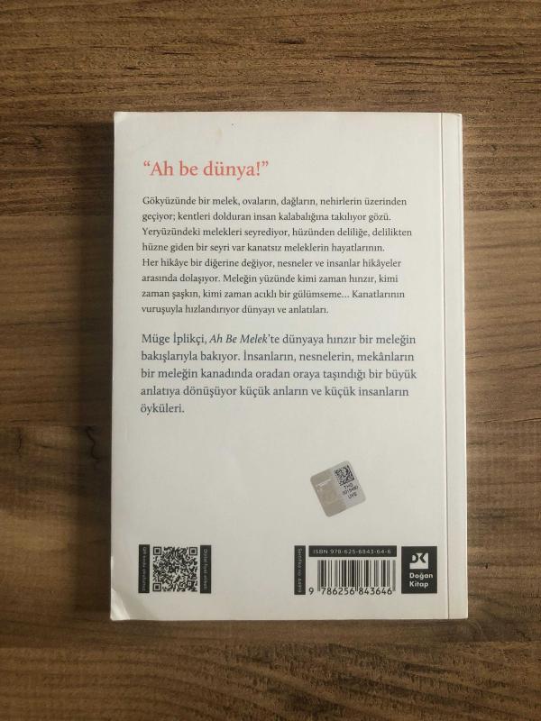 “Ah be dünya!” Gökyüzünde bir melek, ovaların, dağların, nehirlerin üzerinden geçiyor; kentleri dolduran insan kalabalığına takılıyor gözü. Yeryüzündeki melekleri seyrediyor, hüzünden deliliğe, delilikten hüzne giden bir seyri var kanatsız meleklerin hayatlarının. Her hikâye bir diğerine değiyor, nesneler ve insanlar hikâyeler arasında dolaşıyor. Meleğin yüzünde kimi zaman hınzır, kimi zaman şaşkın, kimi zaman acıklı bir gülümseme… Kanatlarının vuruşuyla hızlandırıyor dünyayı ve anlatıları. Müge İplikçi, Ah Be Melek’te dünyaya hınzır bir meleğin bakışlarıyla bakıyor. İnsanların, nesnelerin, mekânların bir meleğin kanadında oradan oraya taşındığı bir büyük anlatıya dönüşüyor küçük anların ve küçük insanların öyküleri.