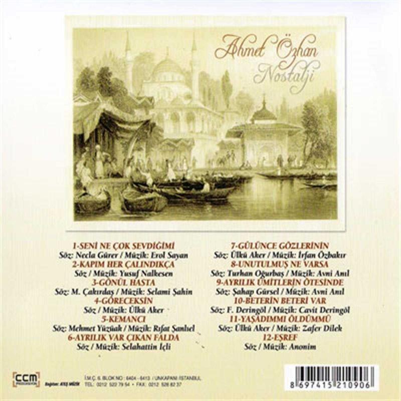 Ahmet Özhan -Nostalji CD SIFIR JELATİNLİ AMBALAJINDADIR yurtiçi aras veya Ptt kargo ile gönderilecektir. Seni Ne Çok Sevdiğimi Söz. Necla Gürer Müzik: Erol Sayan Kapım Her Çalındıkça Söz & Müzik: Yusuf Nalkesen Gönül Hasta Söz: M.Çakırdaş Müzik: Selami Şahin Göreceksin Söz & Müzik: Ülkü Aker Kemancı Söz: Mehmet Yüzüak Müzik: Rıfat Şanlıel Ayrılık Var Çıkan Falda Söz & Müzik: Selahattin İçli Gülünce Gözlerinin Söz: Ülkü Aker Müzik: İrfan Özbakır Unutulmuş Ne Varsa Söz: Turhan Oğurbaş Müzik: Avni Anıl Ayrılık Ümitlerin Ötesinde Söz: Şahap Gürsel Müzik: Avni Anıl Beterin Beteri Var Söz: F. Deringöl Müzik: Cavit Deringöl Yaşadım mı Öldüm mü Söz: Ülkü Aker Müzik: Zafer Dilek Eşref Söz & Müzik: Anonim