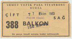 TİYATRO BİLETİ. Bursa Ahmet Vefik Paşa Tiyatrosu’nun 27 Ekim 1963 tarihli “balkon” bileti. Arkasında “Palto ve şapkaların vestiyere verilmesi mecburidir” gibi şartlar sıralanmış. Kondisyonu iyi. 10x5 cm.