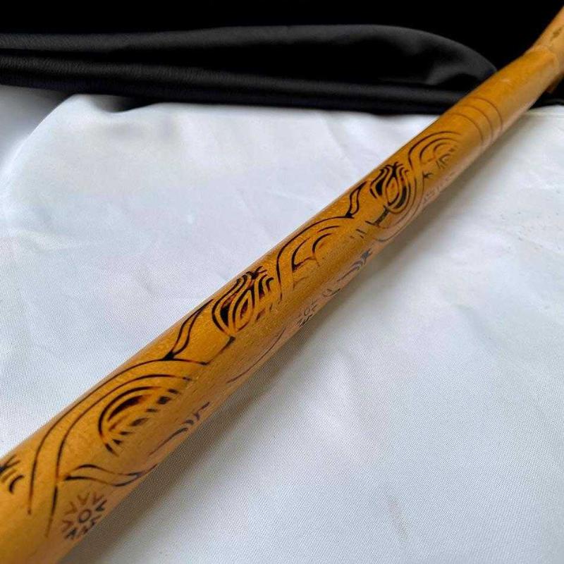 Zarif el oyması, mahmuz saplı baston. Gövdesinde zarif desenler var. Baston iyi durumda, herhangi bir çatlak vs yoktur. Dekoratif ahşap aksesuar olarak ya da günlük kullanabilirsiniz. 88 cm 350 gr
