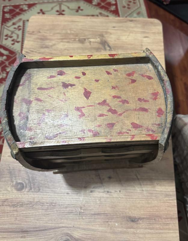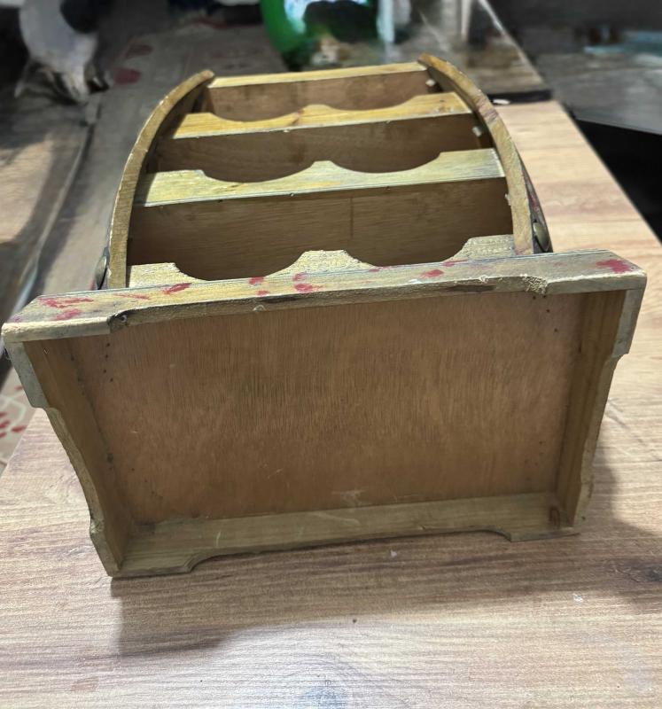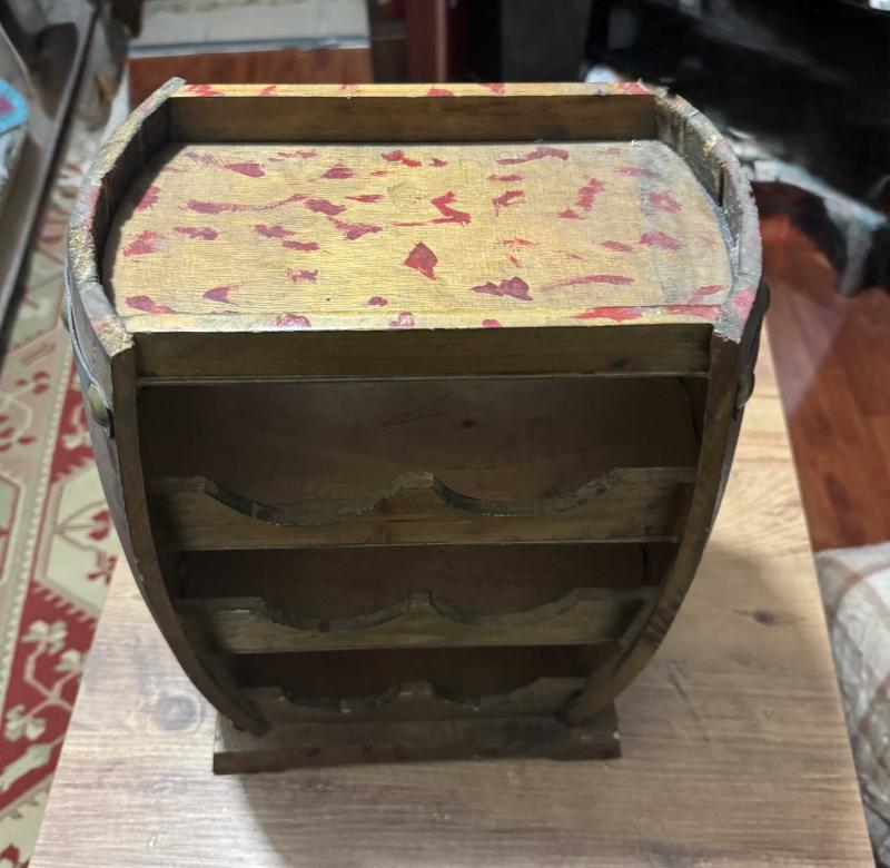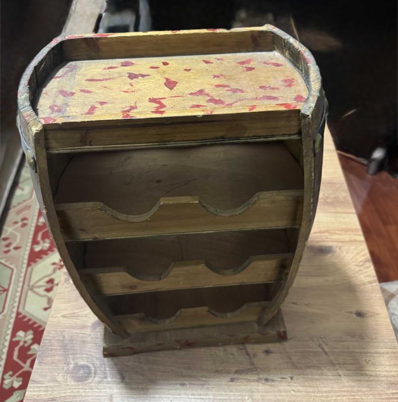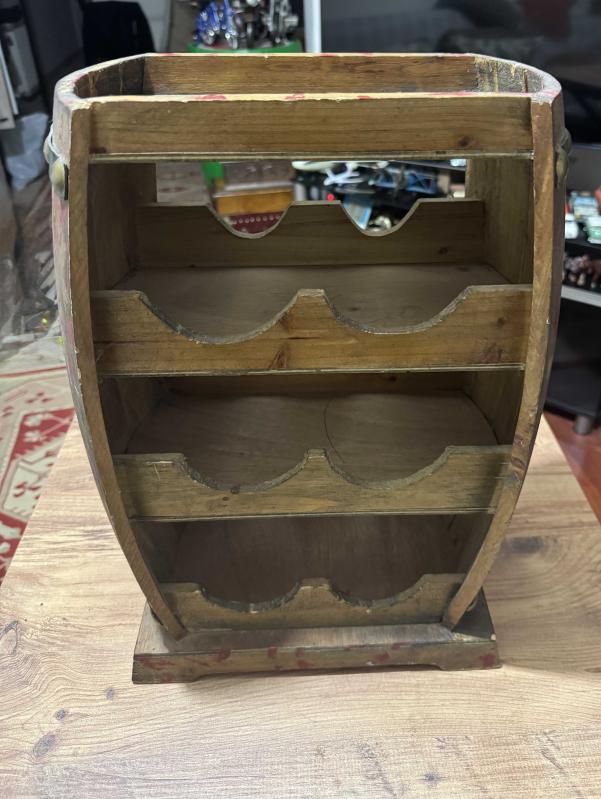 Ahşap Fıçı Tasarımlı Dekoratif Şişe Standı Evinize veya ofisinize otantik bir hava katacak, fıçı formunda tasarlanmış ahşap şaraplık. Hem dekoratif bir obje hem de kullanışlı bir düzenleyicidir. 6 adet şişe bölmesi üst kısımda sunum/bardak alanı. Doğal ahşap, eskitme görünümlü. Temiz, sağlam ve kullanıma hazır. başlıklı antika/koleksiyon objesi Türkiye menşe’lidir. Objenin ait olduğu dönem bilinmeketedir.