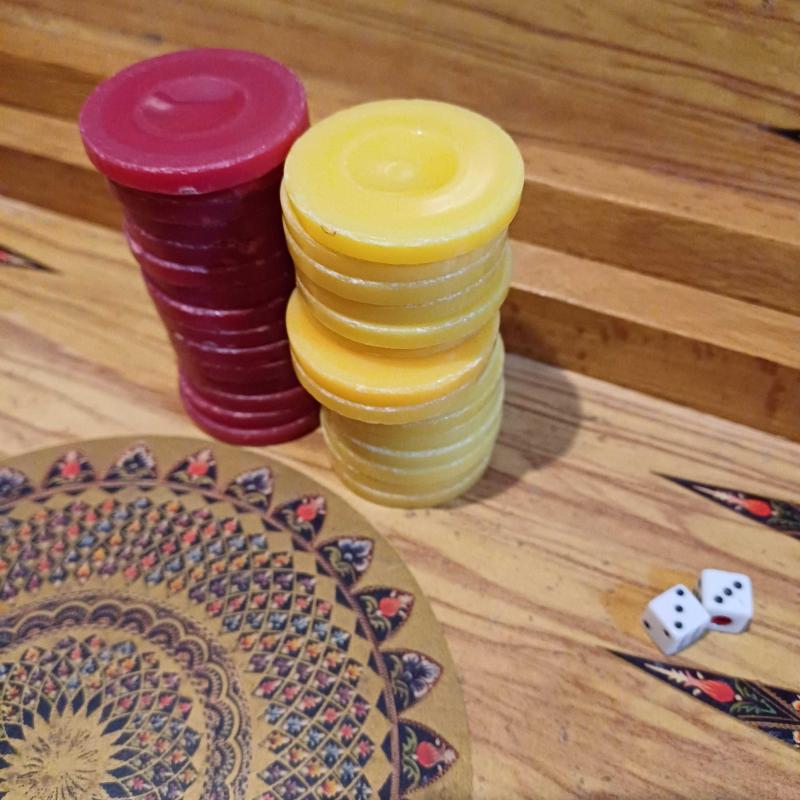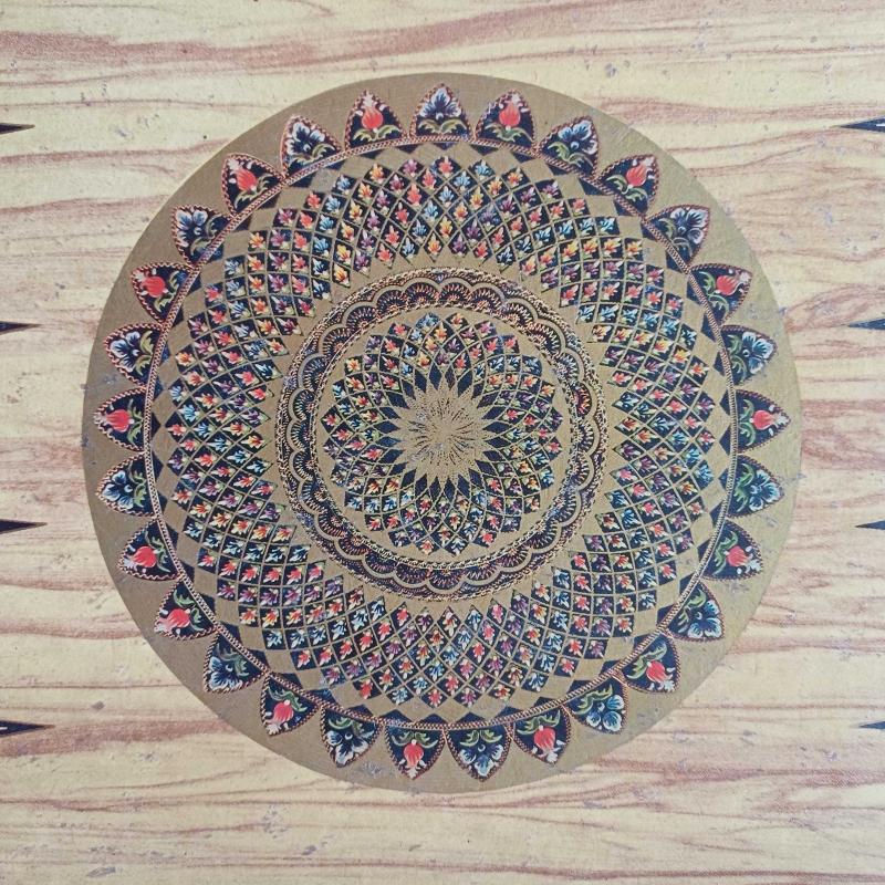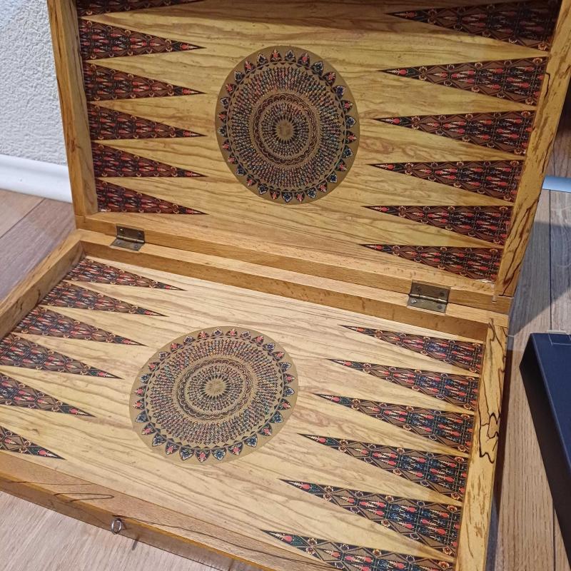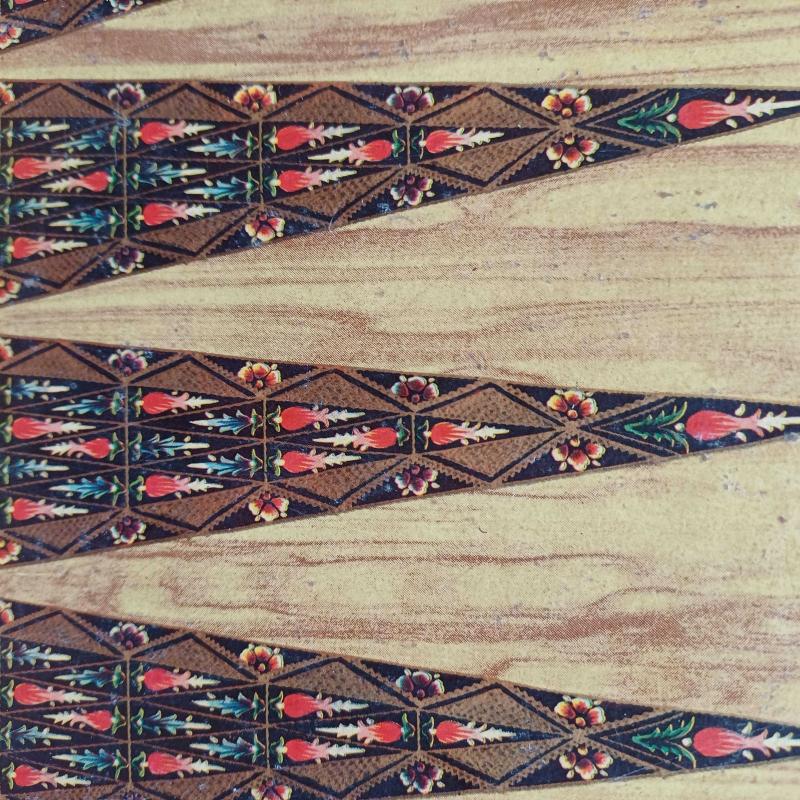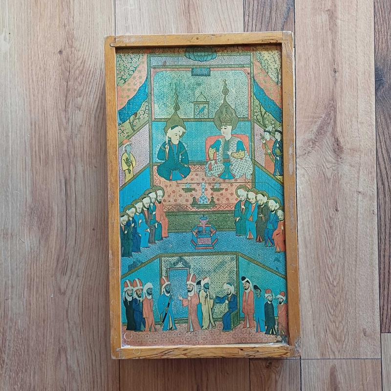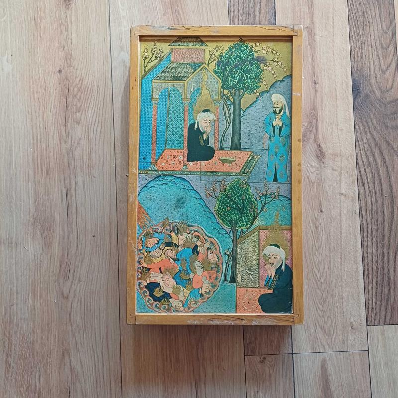 Yıl 1980 Yer Marmaris/Muğla Tavla öğrendiğim ilk Ahşap tavla. Dışında Topkapı Sarayı'nda sergilenen 16. Yy minyatur görselleri ve İçinde Osmanlı dönemi tezhip (susleme) sanatı örnekleri ile bezenmiş. Akrilik pembe ve sarı pullar. Aynı döneme ait bir çift zar. Harika durumda. İlgilisine koleksiyonluk.