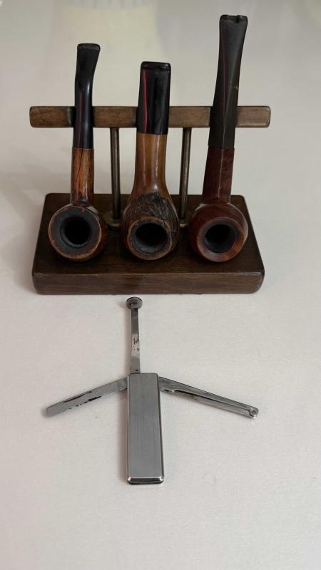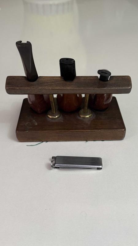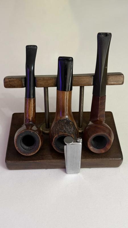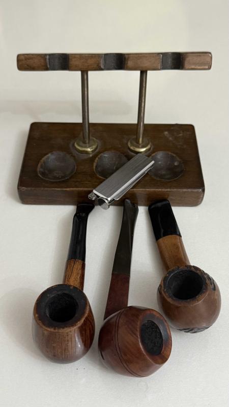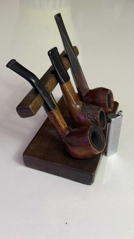 Görselde üç adet ahşap gövdeli, siyah ağızlıkli pipo ve bir adet metal çakmak sergilenmektedir. Pipo standı ahşaptan yapılmıştır. Set, pipo severler için ideal bir hediyelik olabilir. Çelik üsten basmalıl temizleme aparatı ahşap stantt bronz detaylı dönem eski koleksiyonluk set