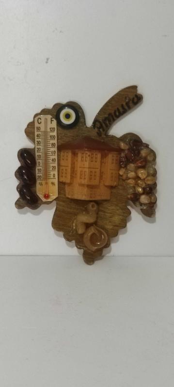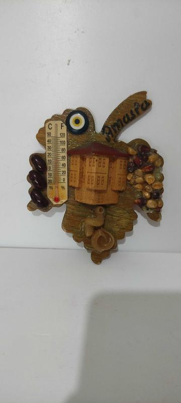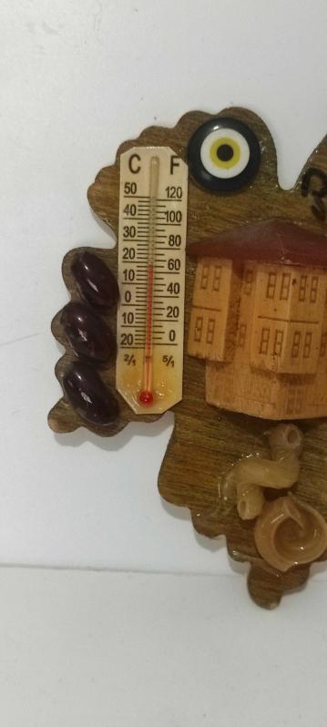 Ahşap buzdolabı magneti Termometreli başlıklı antika/koleksiyon objesi Türkiye menşe’lidir. 2000 ve sonrası dönemine aittir.
