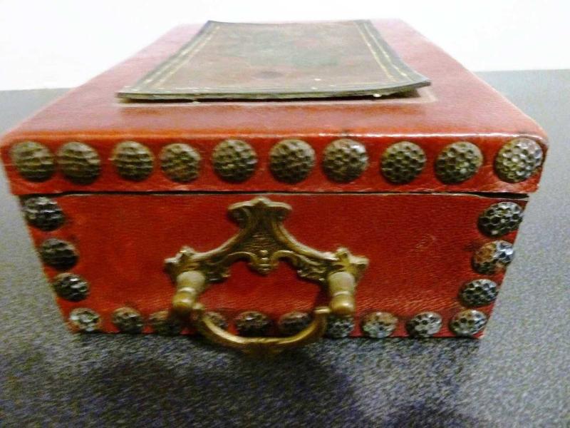 Ahşap deri kaplama mücevher kutusu. İki yanında bronz kulplar mevcut. 20x15cm. Y:8 cm.