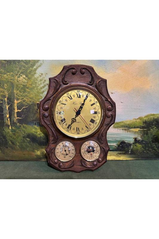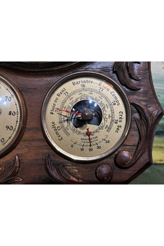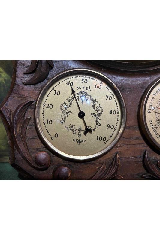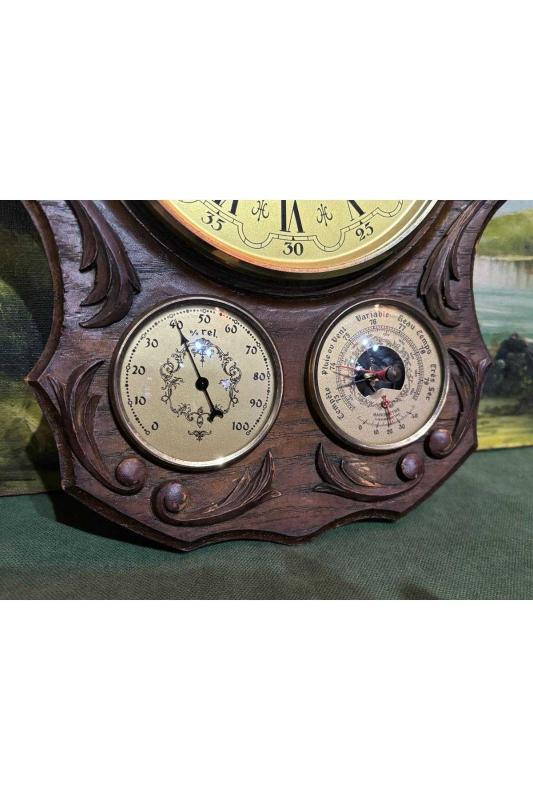 Ahşap kaidesinde antika fransız saat derece barometre ve higrometre 34 cm 24 cm ölçülerinde başlıklı antika/koleksiyon objesinin menşei belirtilmemiştir. Objenin ait olduğu dönem bilinmeketedir.