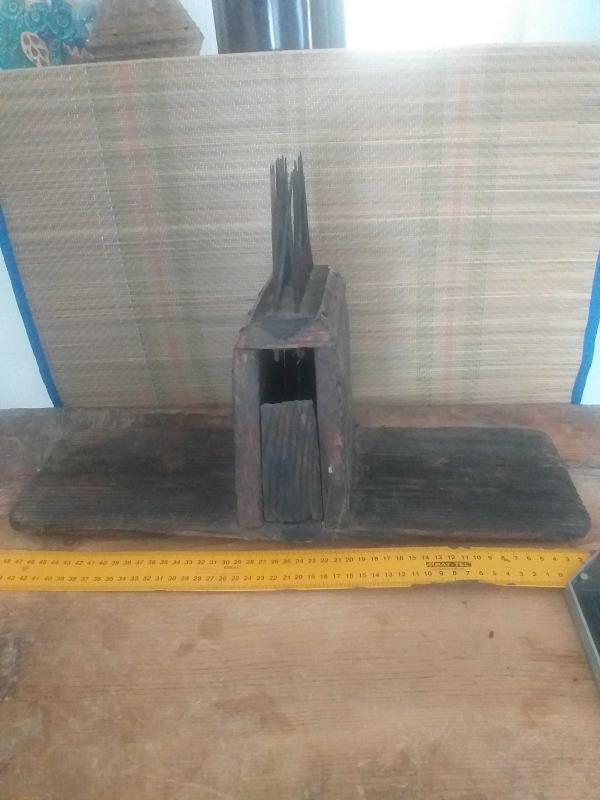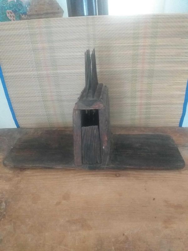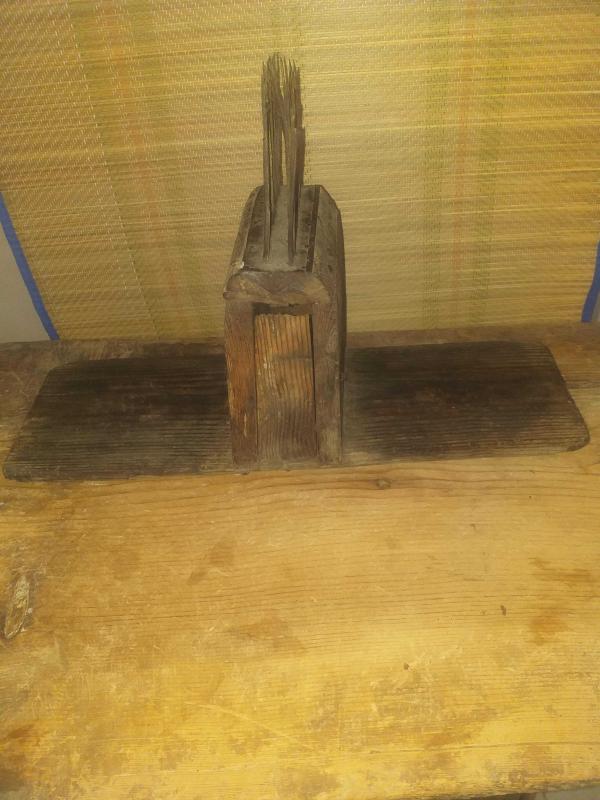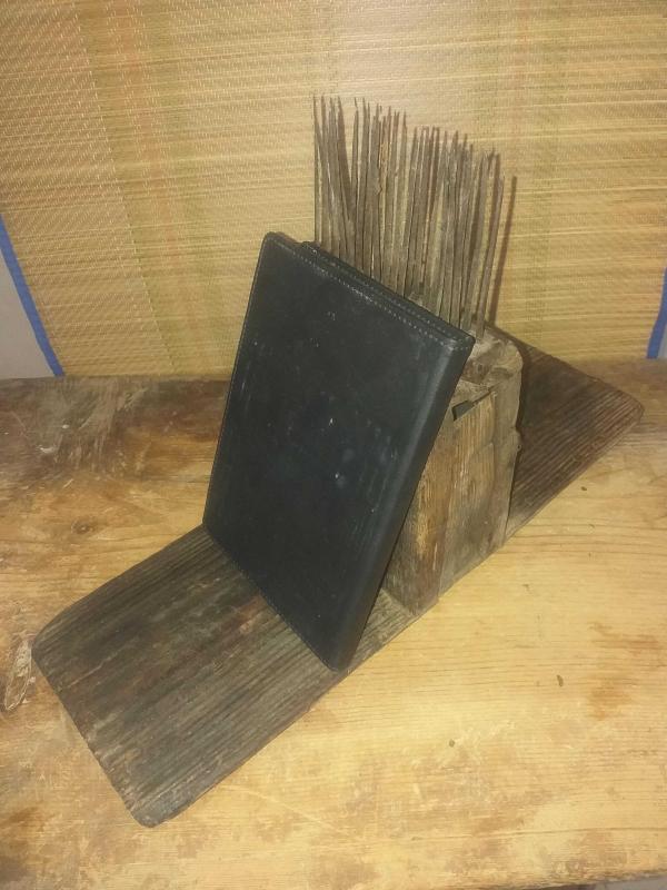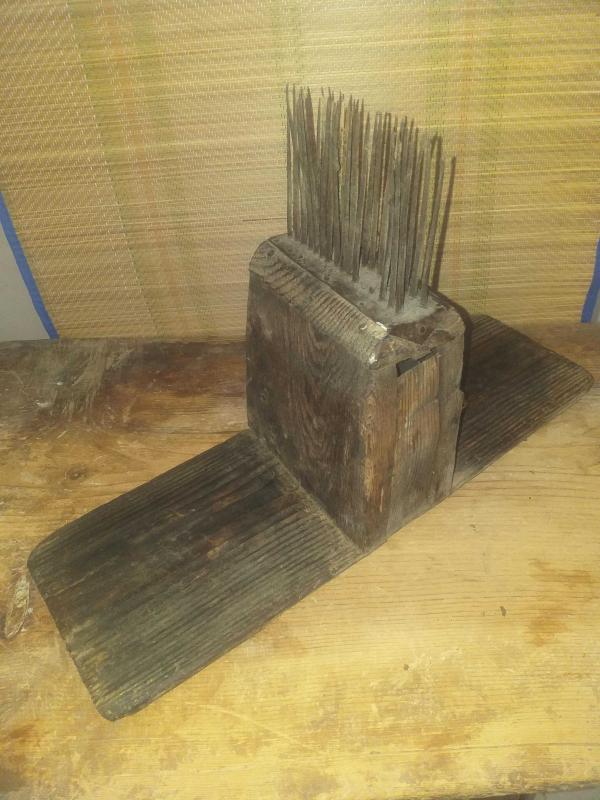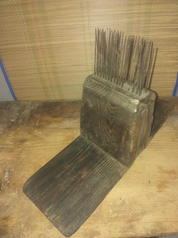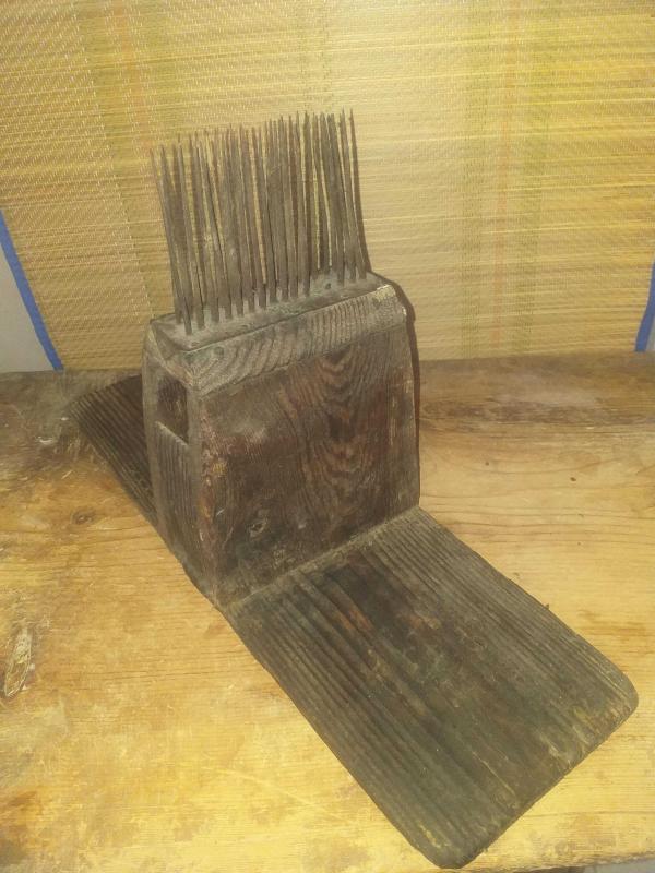 Döneminde iplik yapmak üzere keten veya yünün tarandığı , tarağın dişlerinin her biri dövme demirden , gövdesi ise eskirken çok güzel patine almış , yüzeyleri yörük işi ,türkmen işi oymalarla süslü tarak... kullanım amacını değiştirerek zamanımıza uyarlarsak kendisi raf olarak kullanılabilir veya mevcut rafa ya da masaya konularak kitap tutucu olarak kullanılabilir ve şık olur... Kullanım aleti , reprodüksiyon , reproduction , ethnografik sanat , ethnografic art . folk art...