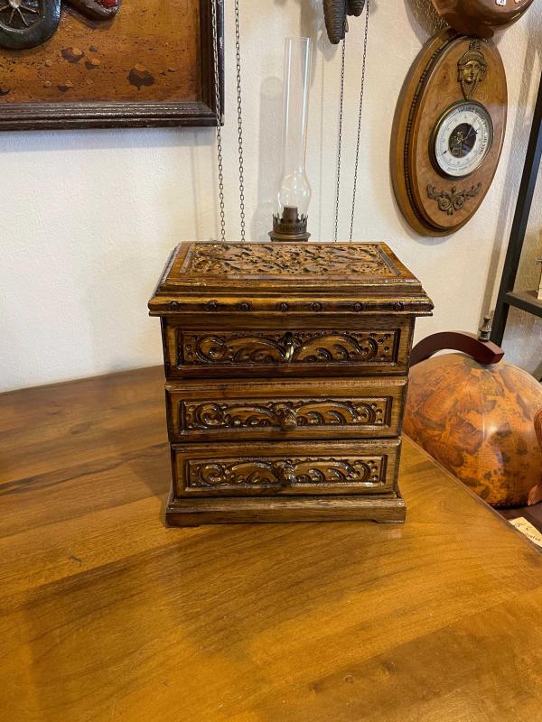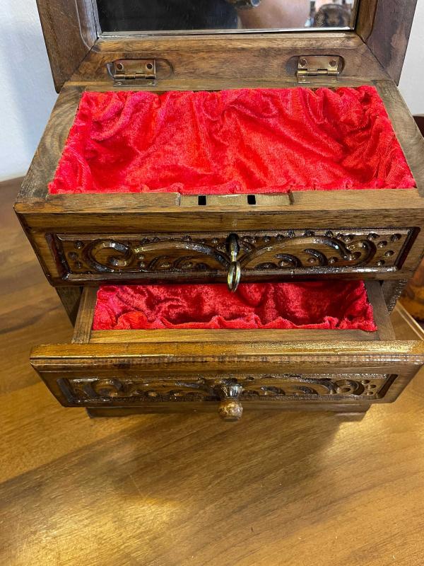 Ahşap kilitli aynalı çekmeceli sandık başlıklı antika/koleksiyon objesi Türkiye menşe’lidir. 2000 ve sonrası dönemine aittir.