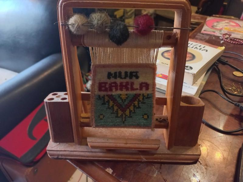 Ahşap minyatür halı tezgahı kalemlikm 23x21 cm noyutlarında başlıklı antika/koleksiyon objesi Türkiye menşe’lidir. 1950-1999 arası dönemine aittir.