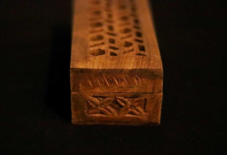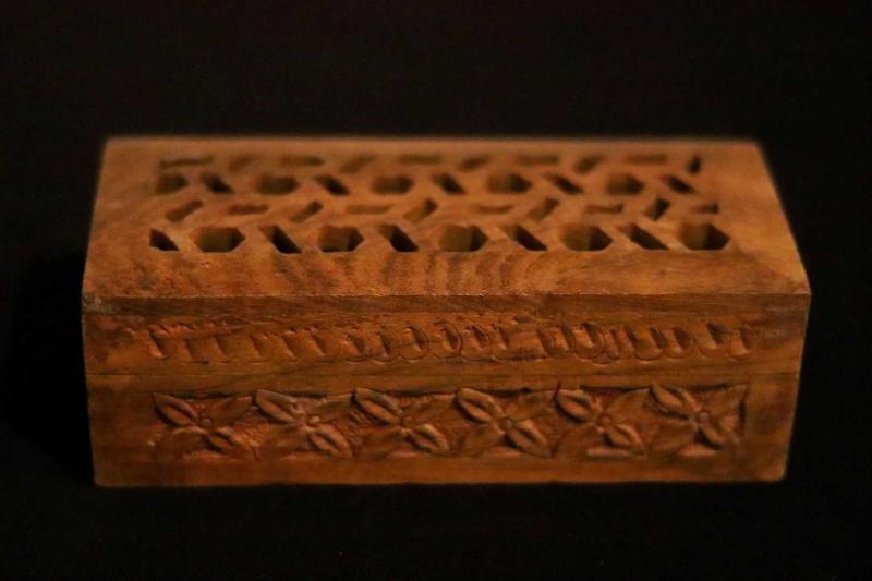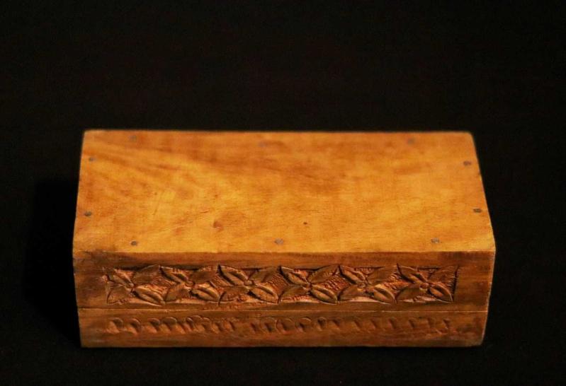 Ahşap, yüzeyi el oyması, sandık formunda kapağı açılabilir mücevher kutusu. 15x7 cm. Y 5cm. başlıklı antika/koleksiyon objesinin menşei belirtilmemiştir. 1900-1949 arası dönemine aittir.