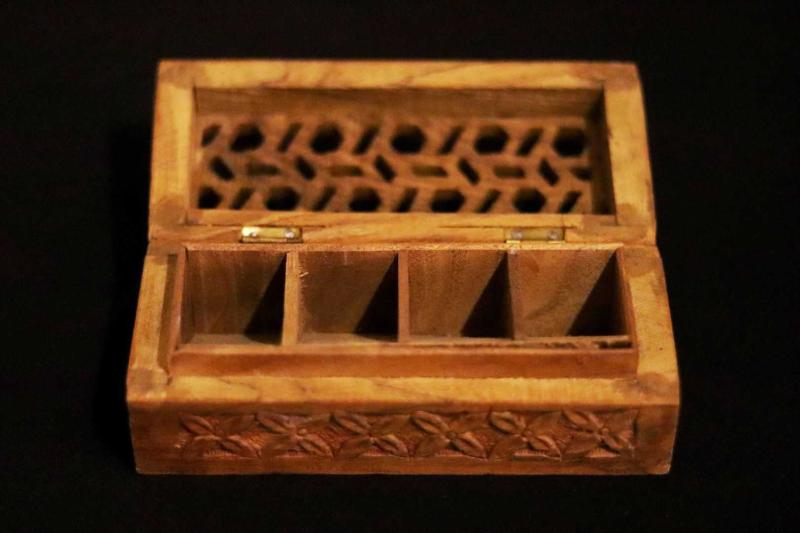 Ahşap yüzeyi el oyması sandık formunda kapağı açılabilir mücevher kutusu. 15x7cm. Y: 5cm.