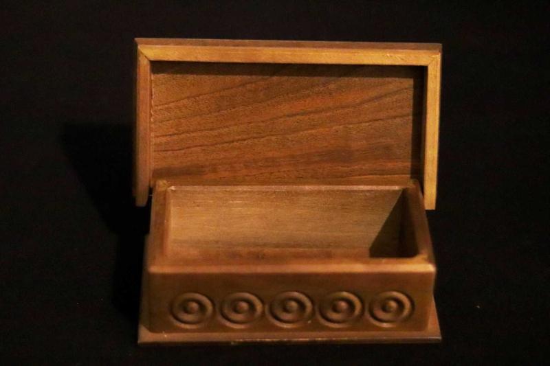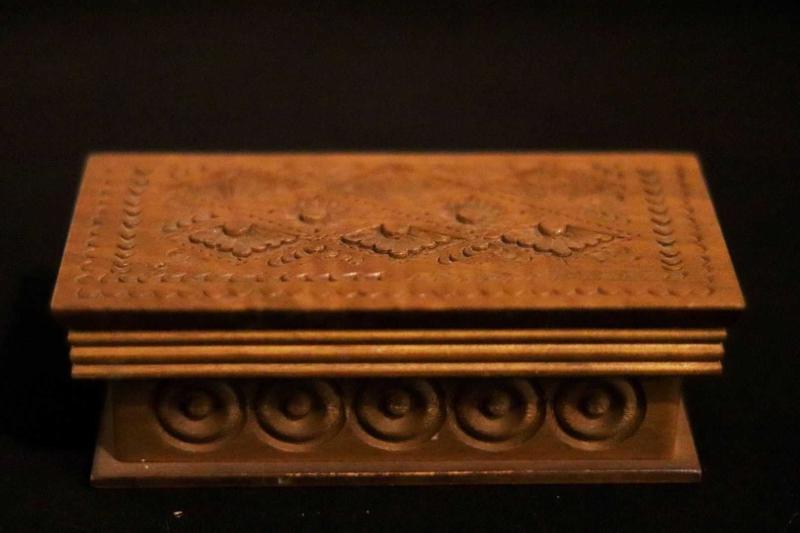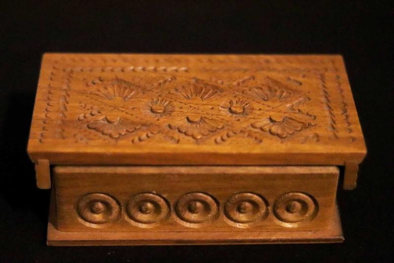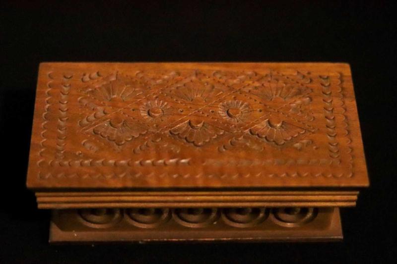 Ahşap, yüzeyi el oyması, sandık formunda kapağı açılabilir mücevher kutusu. 15x7 cm. Y 5cm. başlıklı antika/koleksiyon objesinin menşei belirtilmemiştir. 1900-1949 arası dönemine aittir.