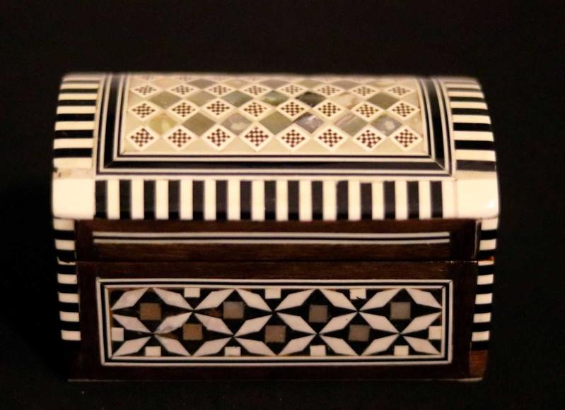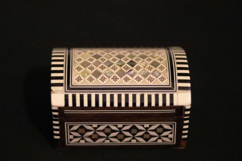Ahşap, yüzeyi parküteri ve sedef çalışması, sandık formunda mücevher kutusu. 11x7cm. Y 7cm. başlıklı antika/koleksiyon objesinin menşei belirtilmemiştir. 1900-1949 arası dönemine aittir.