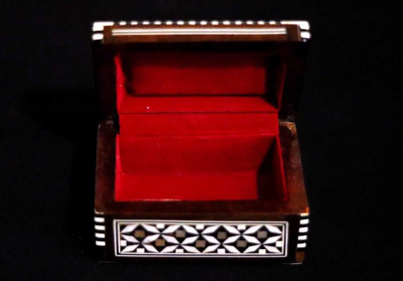 Ahşap, yüzeyi parküteri ve sedef çalışması, içi kadife kaplı, sandık formunda kapağı açılabilir mücevher kutusu. 11x7cm. Y: 7cm.