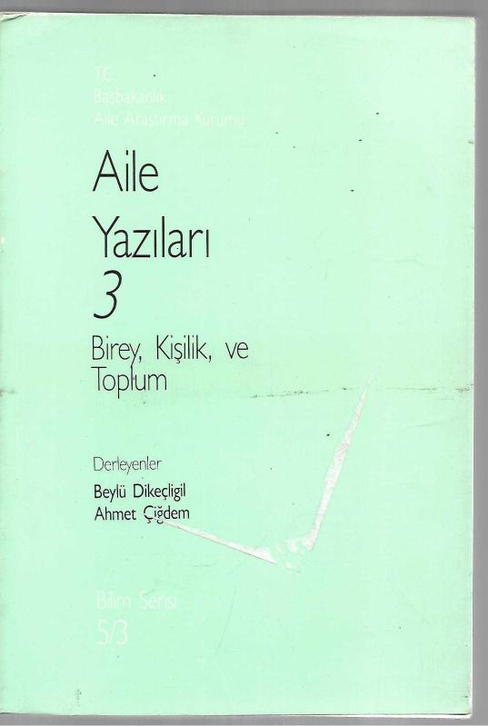 Aile Yazıları 3 - Birey ,Kişilik ve Toplum, Der: Beylü Dikeçligil, Ahmet Çiğdem tarafından kaleme alınmıştır. Kitap 1990 yılında Aile Araştırma Kurumu Yayınları tarafından [Ankara] yayınlanmıştır. 424 sayfadır. Aile Yazıları 3 - Birey ,Kişilik ve Toplum adlı eser Türkçe dilindedir.