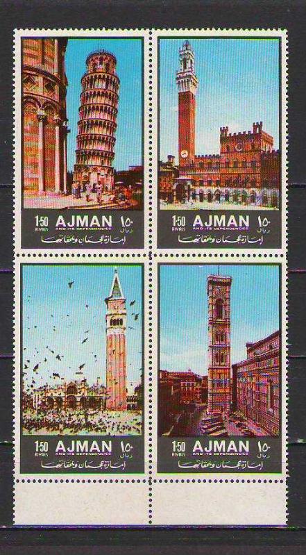 Ajman 1972 - İtalyan mimarisi - Turistik binalar - Anıtlar - MNH - Damgasız - Blok, dün satışa sunulmuştur.