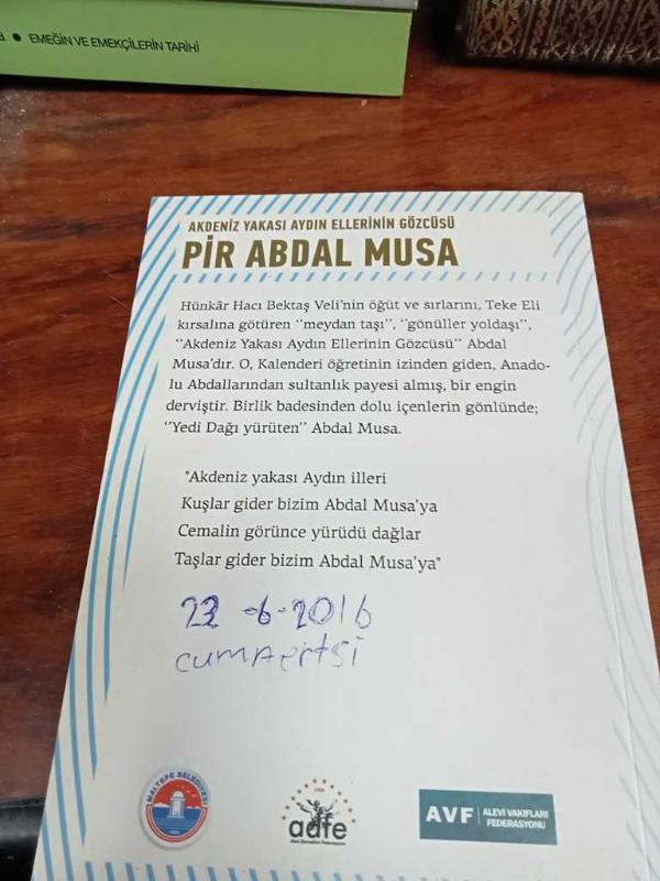 Akdeniz Yakası Aydın Ellerinin Gözcüsü PİR ABDAL MUSA Kızıldeli Sultan,Kaygusuz Abdal,Kafi Baba, Ali Aksüt tarafından kaleme alınmıştır. Kitap AVF tarafından [Antalya] yayınlanmıştır. 80 sayfadır. Akdeniz Yakası Aydın Ellerinin Gözcüsü PİR ABDAL MUSA Kızıldeli Sultan,Kaygusuz Abdal,Kafi Baba adlı eser Türkçe dilindedir.