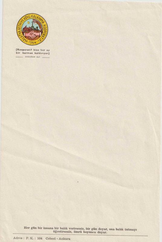 Akdoğan Ali, Malatya Fethiye Köyü Kalkınma Kooperatifi Antetli Kağıt 1964, Kooperatif Bize Her Ay Bir Harman Kaldırıyor ''Her Gün Bir İnsana Bir Balık Verirseniz, Bir Gün Doyar, Ona Balık Tutmayı Öğretirseniz, Ömrü Boyunca Doyar.'', 4 yıl önce satışa sunulmuştur.