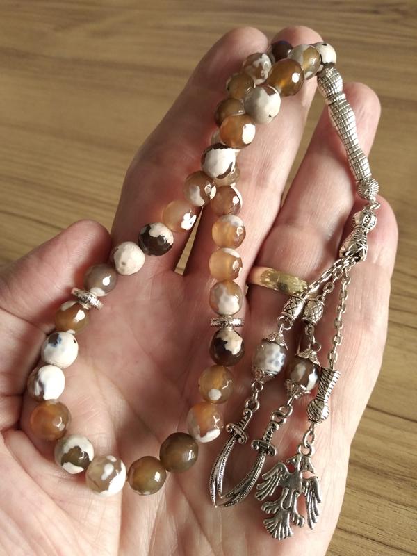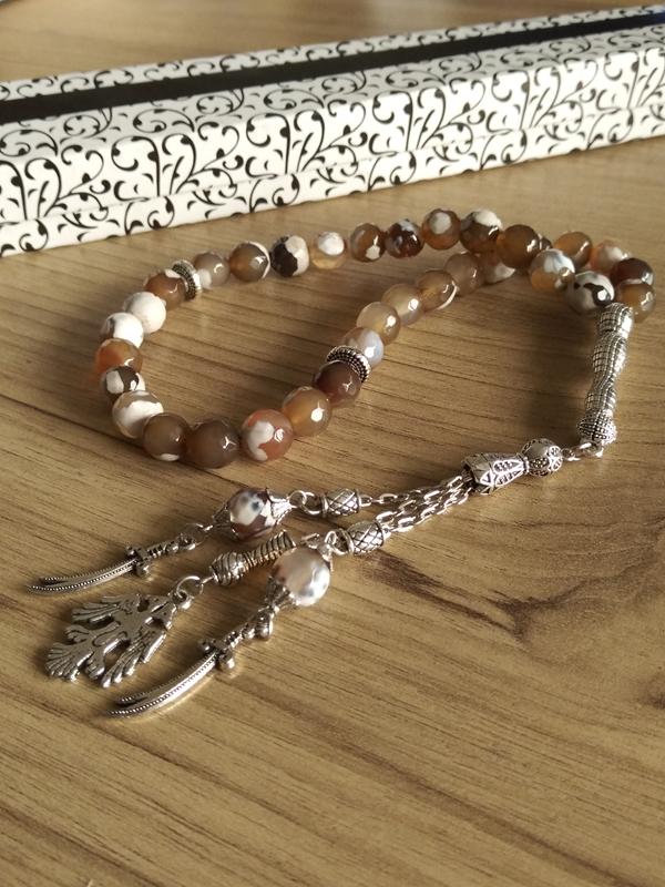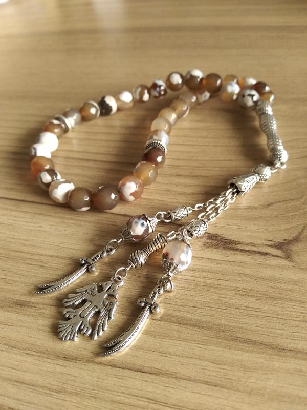 Koleksiyonluk veya hediyelik günlük kullanıma uygun, her detayı ince düşünülmüş 33 'lük tesbih. Taş cinsi: 8 mm faset kesim %100 Akik Doğal taşı. Parlak ve ağır yapıdadır. 35 gr. Dizim: Dayanıklı ve esnek misina ipine dizilmiştir. Çekimi konforludur ve kopmaya karşı dayanıklıdır. Tasarım: 33 Lü sistem. Püskül uçlarında çift başlı Selçuklu Kartalı ve Zülfikar kılıcı figürleri bulunmaktadır. Aksam: Metal kısımlar özel alaşımdır, zor kararan ve uzun ömürlü malzemeden üretilmiştir. Sıfır üründür. Akik taşının yatıştırıcı enerjisiyle Türk tarihinin sembollerini birleştiren özel bir parçadır. Hem koleksiyonluk hem de anlamlı bir hediye arayanlar için idealdir. Türkiye'nin her tarafına hızlı kargo yapılır. Aynı gün veya en geç ertesi gün. Hediyelik kutusu ile gönderilmektedir. Resimdeki kutu stoklara göre farklılık gösterebilir. Yedek ipi ile gönderilmektedir. ÖNEMLİ NOT: RESİMLER ORJİNAL RESİMLERİMİZDİR. ÜRÜN TARAFIMIZCA TASARLANMIŞTIR. ÜRÜN HER DETAYI BİREBİR AYNI OLMAK ÜZERE RESİMDEKİ HALİYLE GÖNDERİLİR.