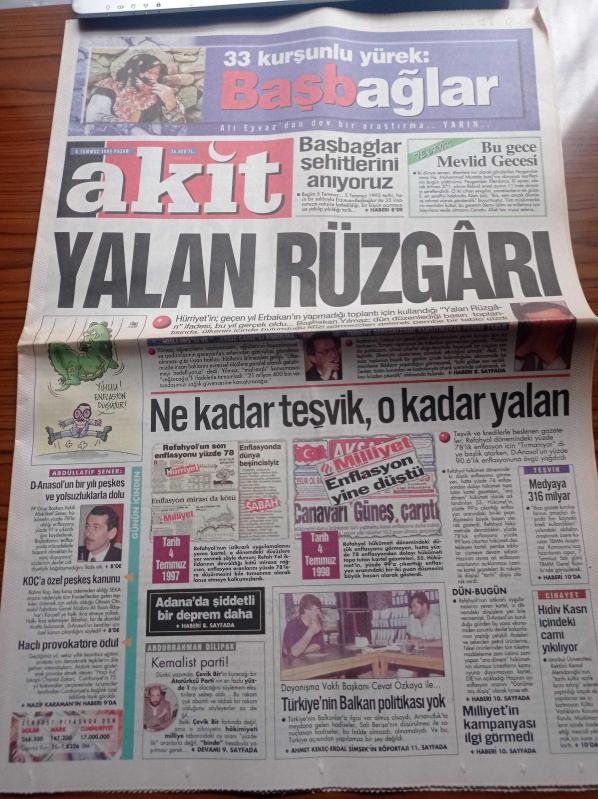 Akit Gazetesi - 5 Temmuz 1998 - Hasan Karakaya - Abdurrahman Dilipak - Hüseyin Üzmez - Ahmet Kekeç - Fransa 98 Dünya Kupası - Tanju Çolak Jübile Yapacak - Özgürlük Yürüyüşü Yazı Dizisi - Başbağlar Şehitlerini Anıyoruz - Mesut Yılmaz - Necmettin Erbakan - Abdüllatif Şener - Dayanışma Vakfı Başkanı Cevat Özkaya - Koç'a Peşkeş Kanunu adlı eser Türkçe dilindedir.