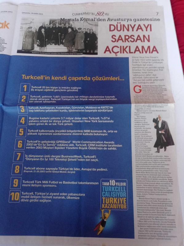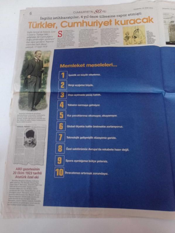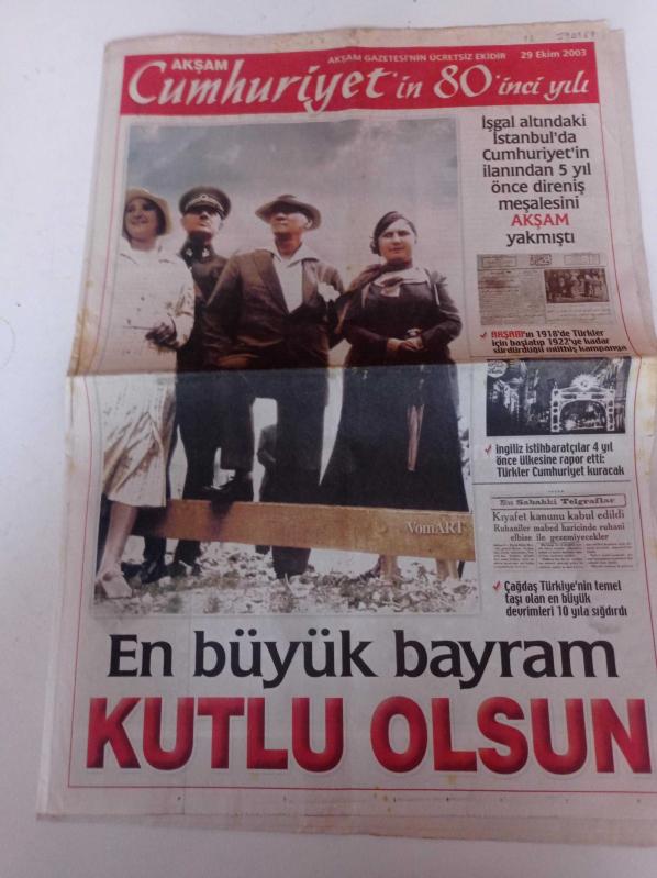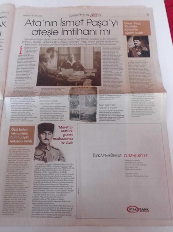 Akşam Cumhuriyet'in 80. Yılı Gazetesi - 29 Ekim 2003 - İşgal Altındaki İstanbul'da Cumhuriyet'in İlanından 5 Yıl Önceki Direniş Meşalesini Akşam Yakmıştı - İngiliz İstihbaratçılar 4 Yıl Önce Ülkesine Rapor Etti Türkler Cumhuriyet Kuracak - Çağdaş Türkiye'nin Temel Taşı Olan En Büyük Devrimleri 10 Yıla Sığdırdı - Ata'nın İsmet Paşa'yı Ateşle İmtihanı Mı- Enver Paşa adlı eser Türkçe dilindedir.