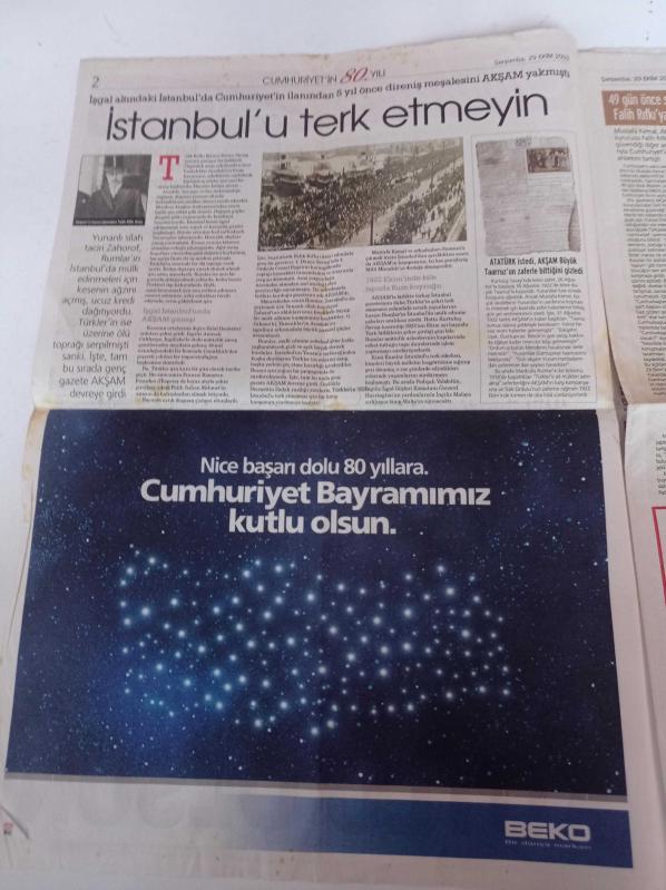 Sayfa Boyutu: 35*56cm Sayfa Sayısı:12 Akşam Cumhuriyet'in 80. Yılı Gazetesi Yıpranma, sararmalar, kupon kesiği ve yırtılmalar zamana bağlı olarak görülebilir