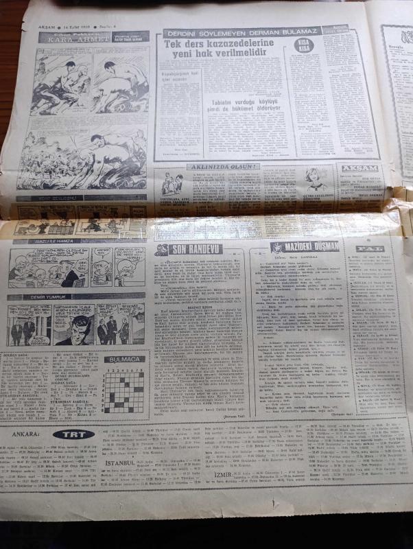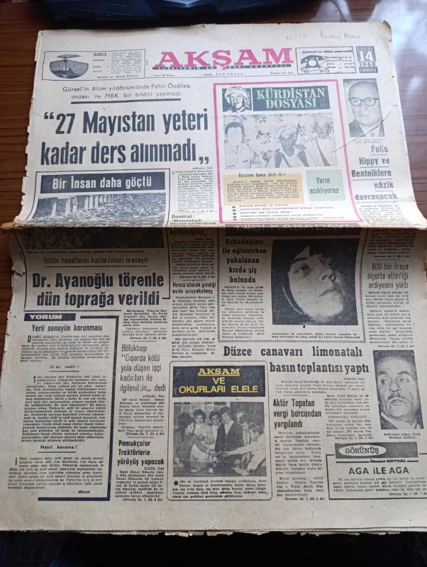 Akşam Gazetesi - 14 Eylül 1968 - Cemal Gürsel'in Ölüm Yıldönümünde Fahri Özdilek İmzası İle Milli Birlik Komitesi Bir Bildiri Yayınladı - 27 Mayıs'tan Yeteri Kadar Ders Alınmadı - Doktor Faruk Ayanoğlu Törenle Dün Toprağa Verildi - Doktor Faruk Ayanoğlu'nun Bütün Hayatını Kurtardıları Oradaydı Fotoğrafı - Kürdistan Dosyası Yarın Açıklıyoruz - Süleyman Demirel Memleketi İleri Götürecek Fikirlerden Korkmayınız Dedi - Aktör Danyal Topatan Vergi Borcundan Yargılandı - Polis Hippy Ve Beatniklere Nazik Davranacak - Karaoğlan Yazan Ve Çizen Suat Yalaz - Mutlak Fakirleşme Oran Olarak Fakirleşme Yazan Çetin Altan Köşe Yazısı - Cihan Pehlivanı Kara Ahmet Yazan Ve Çizen Ratip Tahir Burak - Müzik Yazan Levent Lir - Özdemir Erdoğan Show'lara Başlıyor - Selçuk Ural Sinemaya Geçti - Füsun Önal'a 10 Soru - Şöhret John Lennon'un Başına Vurdu - Elvis Presley - Fenerbahçe Dikkat Manchester City Karşısında En Büyük Rakibiniz Seyircidir - Galatasaray'ı Adana'da Dayak Değil Mağlubiyet Bekliyor adlı eser, Kitap > Süreli Yayınlar > Gazeteler > Türkiye > Genel > Günlük kategorisinde İkinci El olarak satıştadır.