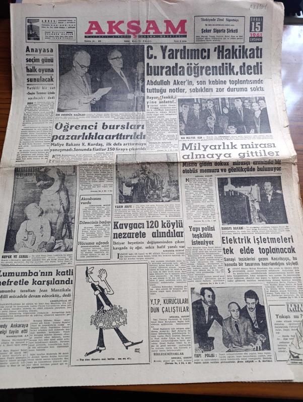 Akşam Gazetesi - 15 Şubat 1961 - Celal Yardımcı Hakikati Burada Öğrendik Dedi - Anayasa Seçim Günü Halk Oyuna Sunulacak - Öğrenci Bursları Pazarlıkla Arttırıldı - Milyarlık Mirası Almaya Mısır'a Giden 9 Mirasçı - Lumumba'nın Katli Nefretle Karşılandı - Elektrik İşletmeleri Tek Elde Toplanacak - Kennedy Ankara'ya Yeni Elçi Tayin Etti - Yeni Türkiye Partisi Kurucuları Dün Çalıştılar - Hülagünün Gözdesi Çizen Suat Yalaz - Ateşli Kız Gina Yazan George Albert Gley Yazı Dizisi - Fırıncılar Fabrika Kurmayı Kabul Etti - 1961 Yılı Balolar Mevsimi Açıldı - Günah Maskesi Aşk Ve His Romanı Resimleyen Remzi - Kont Senlibenli Çizgi Roman - Nazlı İle Hamza Çizgi Roman - Yaralı Gönül Çizgi Roman - Vadiler Hakimi Çizgi Roman - Bursa'da Bir Sanat Gecesi - Sevil Berberi Operası - Gölgeler ve İnsanlar Yazan Victoria Holt Yazı Dizisi - Vasco De Gama Fenerbahçe İle Oynamak İstiyor - Metin Oktay Bu Sezon 35 Gol Atacağım Dedi - Devlet Vekili Hayri Mumcuoğlu Kulüplere Mali Yardımı Vadetti - Futbol Sahası Mı adlı eser, Kitap > Süreli Yayınlar > Gazeteler > Türkiye > Genel > Günlük kategorisinde İkinci El olarak satıştadır.