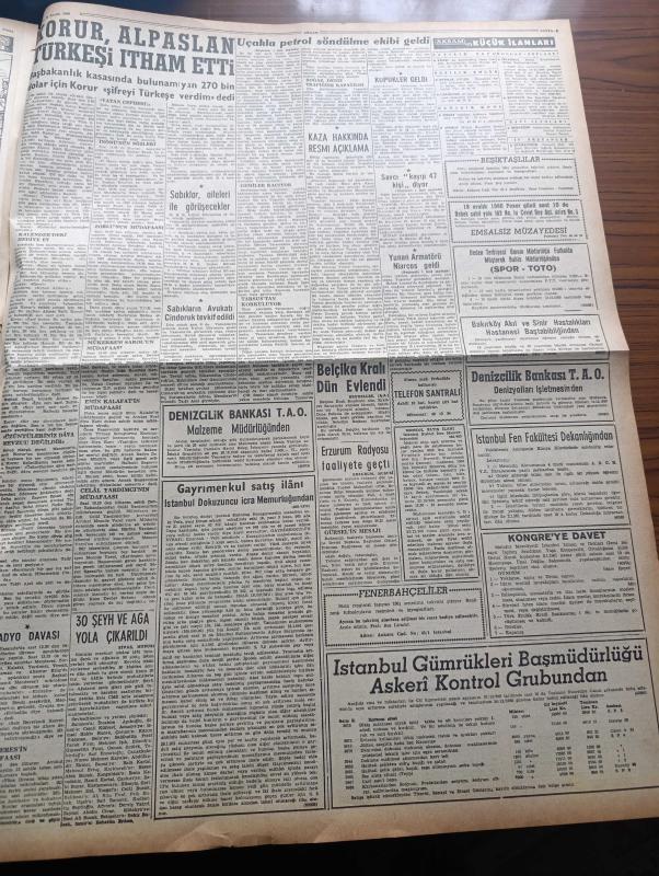 Akşam Gazetesi - 16 Aralık 1960 - Dün Saat 13,50 de Yugoslav Tankeri Peter Zoraniç Müthiş Bir Şekilde İnfilak Etti - Uçakla Petrol Söndürme Ekibi Getirildi - İnfilaktan Evlerin Camları Kırıldı - Zonguldak Kozlu Kömür Ocaklarında Grizu Faciasında Fotoğraflar - Hülagünün Gözdesi Çizen Suat Yalaz - Doğunun Kalkınması Yazan Müşerref Hekimoğlu Köşe Yazısı - Bugün Bu Gece İstanbul Etkinlikleri - Mevlana Celaleddin Rumi Mana Âleminin Padişahıydı - Günah Maskesi Aşk Ve His Romanı Resimleyen Remzi - Diyanet İşleri Başkanlığı Kuranı Tercüme Ettiriyor - Dolce Vita Canlandırıldı - Bize Barbaroslu Derler Yazan Çizen Ratip Tahir Burak - Gölgeler Ve İnsanlar Yazan Victoria Holt Yazı Dizisi - Ahmet Salih Korur Alparslan Türkeş'i İtham Etti - Burç Falınız - Federasyon Ecnebi Hakeme İzin Vermedi - Metin Oktay Dün Hafif Bir Antrenman Yaptı - Fenerbahçeliler Can Bartu Hakkında Kati Konuştu Oynayamaz - Basketbolda Budapeşte Turnuvasında Katılacağız - Osman İncili Spor Köşe Yazısı - Merkez Hakem Komitesi adlı eser, Kitap > Süreli Yayınlar > Gazeteler > Türkiye > Genel > Günlük kategorisinde İkinci El olarak satıştadır.