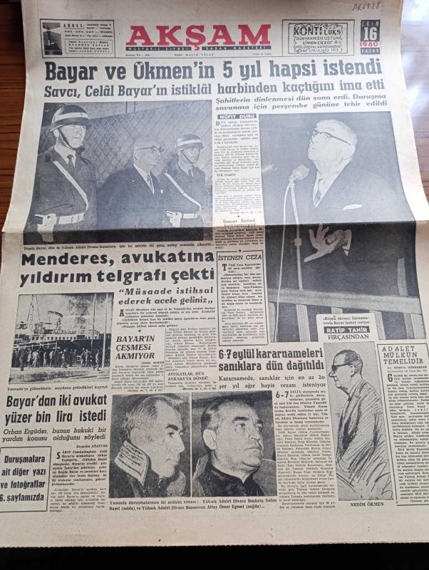Akşam Gazetesi - 16 Ekim 1960 - Celal Bayar Ve Nedim Ökmen'in 5 Yıl Hapsi İstendi - Köpek Davası Duruşmasında Savcı Celal Bayar'ı Dün İstiklal Harbinden Kaçtığını İma Etti - İsmet İnönü Konuşmuyor - Fatin Rüştü Zorlu'nun Annesi Zorlu Davranıyor - Adnan Menderes Avukatı Burhan Apaydın'a Yıldırım Telgrafı Çekti - Celal Bayar'ın Çeşmesi Akmıyor - Celal Bayar'dan İki Avukat Yüzer Bin Lira İstedi - Yüksek Adalet Divanı Başkanı Salim Başol - Yüksek Adalet Divanı Başsavcısı Altay Ömer Egesel - Ratip Tahir Burak'ın Fırçasından Köpek Davası - 6 7 Eylül Kararnameleri Sanıklara Dün Dağıtıldı - Kızkulesi Kahramanı Çizen Suat Yalaz - Yassıada Lokantasında İlk Gün 729 Kişi Yemek Yedi - Günah Maskesi Çizgi Roman Resimleyen Remzi - Kazova Mağazaları - Geyşa'nın Hatıra Defteri Yazan Kimiko Omura Yazı Dizisi - Bize Barbaroslu Derler Çizen Ratip Tahir Burak - Can Bartu Dün Alsancak Stadının Kahramanıydı - Beşiktaş Adana Demirspor'u Yendi - Yabancı Gözüyle Yassıada Mahkemeleri, Malik Yolaç tarafından kaleme alınmıştır. Akşam Gazetesi - 16 Ekim 1960 - Celal Bayar Ve Nedim Ökmen'in 5 Yıl Hapsi İstendi - Köpek Davası Duruşmasında Savcı Celal Bayar'ı Dün İstiklal Harbinden Kaçtığını İma Etti - İsmet İnönü Konuşmuyor - Fatin Rüştü Zorlu'nun Annesi Zorlu Davranıyor - Adnan Menderes Avukatı Burhan Apaydın'a Yıldırım Telgrafı Çekti - Celal Bayar'ın Çeşmesi Akmıyor - Celal Bayar'dan İki Avukat Yüzer Bin Lira İstedi - Yüksek Adalet Divanı Başkanı Salim Başol - Yüksek Adalet Divanı Başsavcısı Altay Ömer Egesel - Ratip Tahir Burak'ın Fırçasından Köpek Davası - 6 7 Eylül Kararnameleri Sanıklara Dün Dağıtıldı - Kızkulesi Kahramanı Çizen Suat Yalaz - Yassıada Lokantasında İlk Gün 729 Kişi Yemek Yedi - Günah Maskesi Çizgi Roman Resimleyen Remzi - Kazova Mağazaları - Geyşa'nın Hatıra Defteri Yazan Kimiko Omura Yazı Dizisi - Bize Barbaroslu Derler Çizen Ratip Tahir Burak - Can Bartu Dün Alsancak Stadının Kahramanıydı - Beşiktaş Adana Demirspor'u Yendi - Yabancı Gözüyle Yassıada Mahkemeleri adlı eser Türkçe dilindedir.
