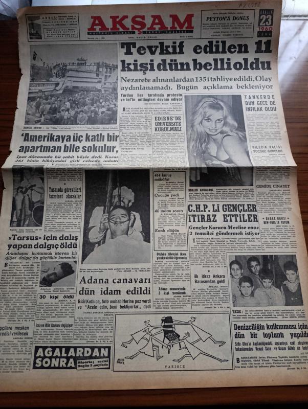 Akşam Gazetesi - 23 Aralık 1960 - Aziz Atatürk'ün Heykeline Tecavüz Olayı - Tevkif Edilen 11 Kişi Dün Belli Oldu - İstinye Tersanesinde Bir Yüzer Havuz Ve Bir De Şehir Hattı Vapuru Denize İndirildi - Adana Canavarı Bilal Kutluca Dün İdam Edildi - İpar Davası - Edirne'de Üniversite Kurulmalı - Hülagünün Gözdesi Çizen Suat Yalaz - Ateşli Kız Gina Yazan George Albert Gley Yazı Dizisi - Müşerref Hekimoğlu Köşe Yazısı - Dün Balıkhaneye 50 Ton Uskumru Balığı Getirildi - Ağalardan Sonra Röportaj Müfit Duru Yazı Dizisi - Şeyh Sait'in Oğlu Salahattin Fırat Ben Yobaz İlimsiz Şeyh Değilim Diyor - Yılbaşı Hediyesi Nasıl Olmalı - Gölgeler ve İnsanlar Yazan Victoria Holt Yazı Dizisi - Nazlı İle Hamza Karikatür - Yaralı Gönül Çizgi Roman - Vadiler Hakimi Çizgi Roman - Fenerbahçe Beşiktaş İle Yapacağını Kritik Maçta Can Bartu Oynayacak - Galatasaray Ankara'ya Gitti - Toto'da Kazanılan 30 Bin TL İkramiye Sahibini Bekliyor - Kasımpaşa Ali Sami Yen Stadında Çalışamadı - Sivas'taki Güreşler - Vehbi Emre