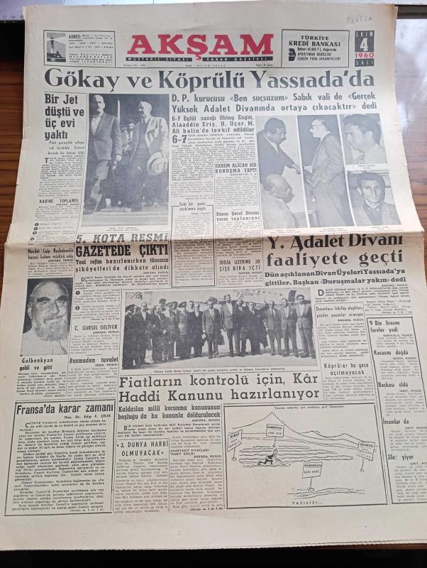 Akşam Gazetesi - 4 Ekim 1960 - Fahrettin Kerim Gökay Ve Fuat Köprülü Yassıada'da - 6 7 Eylül Sanığı Oktay Engin Alaeddin Eriş Hasan Uçar M. Ali Balin'de Tevkif Edildiler - Ekrem Alican Bir Konuşma Yaptı - Yüksek Adalet Divanı Faaliyete Geçti - Duvarlarda İnkılap Aleyhtarı Yazılar Yazanlar Aranıyor - Necdet Calp Başbakanlık Hususi Kalem Müdürü Oldu - Dünyanın Sayılı Zengini Nubar Gülbenkyan Geldi Ve Gitti - Kızkulesi Kahramanı Çizen Suat Yalaz - 93 İhtilali Yazan Abdullah Ziya Kozanoğlu Yazı Dizisi - Dansöz Ayşe Nana Roma'da Yargılanıyor - Günahım Seni Sevmek Aşk Ve His Romanı Resimleyen Remzi - Geyşa'nın Hatıra Defteri Yazan Kimiko Omura Yazı Dizisi - Bize Barbaroslu Derler Yazan Çizen Ratip Tahir Burak - Kont Senlibenli Çizgi Roman - Nazlı İle Hamza Çizgi Roman - Vadiler Hakimi Çizgi Roman - Galatasaray Bahia İle 1 1 Berabere Kaldı - Mithatpaşanın Tevsii Mi Yüzbinlik Yeni Bir Stad Mı - Yorgun Beşiktaş 4 Puan Alamaz - Spor Yazarları Kongresi Yapıldı - Türkiye Yüzme Şampiyonası, Malik Yolaç tarafından kaleme alınmıştır. Akşam Gazetesi - 4 Ekim 1960 - Fahrettin Kerim Gökay Ve Fuat Köprülü Yassıada'da - 6 7 Eylül Sanığı Oktay Engin Alaeddin Eriş Hasan Uçar M. Ali Balin'de Tevkif Edildiler - Ekrem Alican Bir Konuşma Yaptı - Yüksek Adalet Divanı Faaliyete Geçti - Duvarlarda İnkılap Aleyhtarı Yazılar Yazanlar Aranıyor - Necdet Calp Başbakanlık Hususi Kalem Müdürü Oldu - Dünyanın Sayılı Zengini Nubar Gülbenkyan Geldi Ve Gitti - Kızkulesi Kahramanı Çizen Suat Yalaz - 93 İhtilali Yazan Abdullah Ziya Kozanoğlu Yazı Dizisi - Dansöz Ayşe Nana Roma'da Yargılanıyor - Günahım Seni Sevmek Aşk Ve His Romanı Resimleyen Remzi - Geyşa'nın Hatıra Defteri Yazan Kimiko Omura Yazı Dizisi - Bize Barbaroslu Derler Yazan Çizen Ratip Tahir Burak - Kont Senlibenli Çizgi Roman - Nazlı İle Hamza Çizgi Roman - Vadiler Hakimi Çizgi Roman - Galatasaray Bahia İle 1 1 Berabere Kaldı - Mithatpaşanın Tevsii Mi Yüzbinlik Yeni Bir Stad Mı - Yorgun Beşiktaş 4 Puan Alamaz - Spor Yazarları Kongresi Yapıldı - Türkiye Yüzme Şampiyonası adlı eser Türkçe dilindedir.