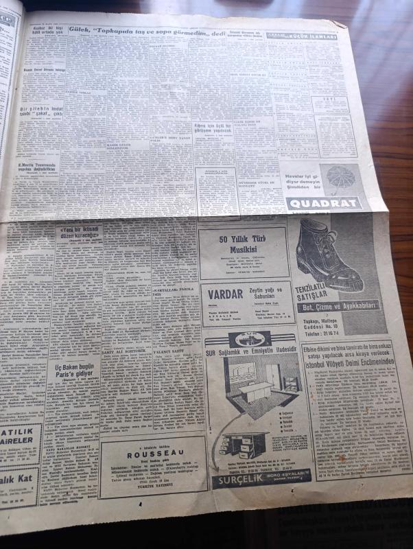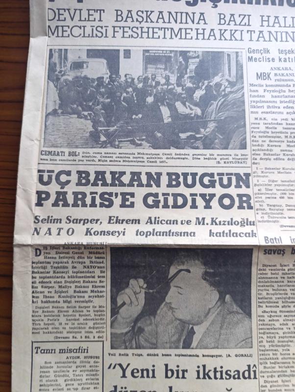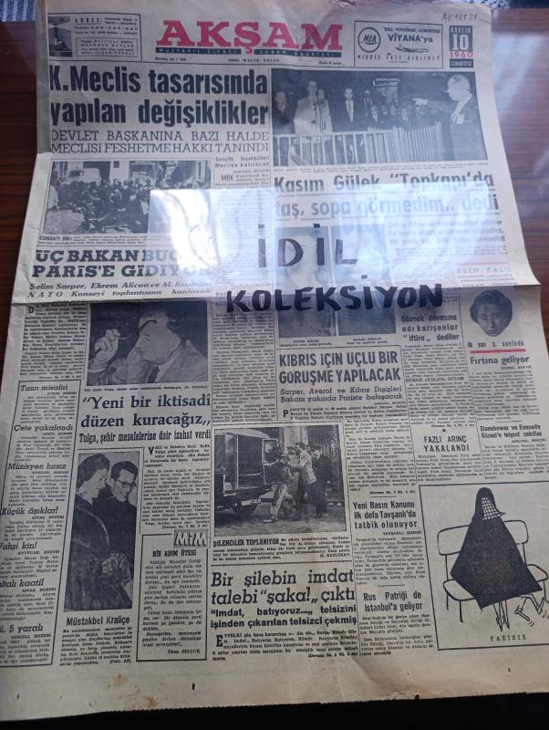 Akşam Gazetesi - Turkish Newspaper - 10 Aralık 1960 - kurucu meclis tasarısında yapılan değişiklikler - devlet başkanına bazı halde meclisi feshetme hakkı tanındı - 3 bakan Selim Sarper Ekrem Alican ve Muharrem İhsan Kızıloğlu Paris'e gidiyor - vali ve belediye reisi Refik Tulga dünkü basın toplantısında konuşuyor fotoğraf - Kasım Gülek Topkapı'da taş sopa görmedim dedi fotoğraf - olaylar sırasında İstanbul 3. Şube müdürü olan Nazım Sevin şehadeti esnasında bazı mütecavizleri de teşhis etti Fotoğrafı - ödenek davasına adı karışanlar iftira dediler - Kıbrıs için üçlü bir görüşme yapılacak - yeni basın kanunu ilk defa Tavşanlı'da tatbik olunuyor - Rus patriği de İstanbul'a geliyor - İstanbul'da bugün bu gece sinema tiyatro programı - Hülagünün gözdesi yazan Abdullah Ziya Kozanoğlu Çizen Suat Yalaz - NATO Türkiye Amerika yazan Müşerref Hekimoğlu - Ateşli Kız Gina yazan George Albert Gley Yazı Dizisi - ocakta transfer kabul edildi - Samim Uygun Galatasaray ile profesyonel mukavele imza adlı eser, Kitap > Süreli Yayınlar > Gazeteler > Türkiye > Genel > Günlük kategorisinde İkinci El olarak satıştadır.
