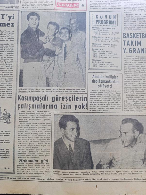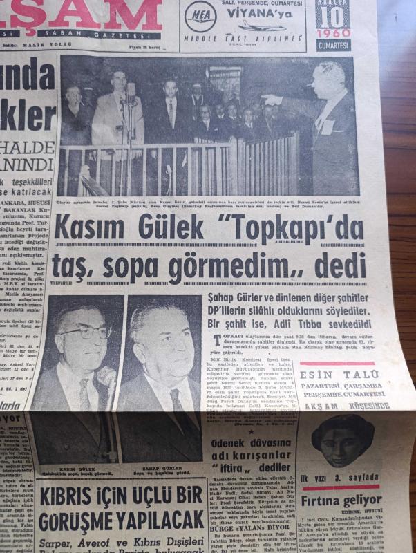 Akşam Gazetesi - Turkish Newspaper - 10 Aralık 1960 - kurucu meclis tasarısında yapılan değişiklikler - devlet başkanına bazı halde meclisi feshetme hakkı tanındı - 3 bakan Selim Sarper Ekrem Alican ve Muharrem İhsan Kızıloğlu Paris'e gidiyor - vali ve belediye reisi Refik Tulga dünkü basın toplantısında konuşuyor fotoğraf - Kasım Gülek Topkapı'da taş sopa görmedim dedi fotoğraf - olaylar sırasında İstanbul 3. Şube müdürü olan Nazım Sevin şehadeti esnasında bazı mütecavizleri de teşhis etti Fotoğrafı - ödenek davasına adı karışanlar iftira dediler - Kıbrıs için üçlü bir görüşme yapılacak - yeni basın kanunu ilk defa Tavşanlı'da tatbik olunuyor - Rus patriği de İstanbul'a geliyor - İstanbul'da bugün bu gece sinema tiyatro programı - Hülagünün gözdesi yazan Abdullah Ziya Kozanoğlu Çizen Suat Yalaz - NATO Türkiye Amerika yazan Müşerref Hekimoğlu - Ateşli Kız Gina yazan George Albert Gley Yazı Dizisi - ocakta transfer kabul edildi - Samim Uygun Galatasaray ile profesyonel mukavele imza, Malik Yolaç tarafından kaleme alınmıştır. Akşam Gazetesi - Turkish Newspaper - 10 Aralık 1960 - kurucu meclis tasarısında yapılan değişiklikler - devlet başkanına bazı halde meclisi feshetme hakkı tanındı - 3 bakan Selim Sarper Ekrem Alican ve Muharrem İhsan Kızıloğlu Paris'e gidiyor - vali ve belediye reisi Refik Tulga dünkü basın toplantısında konuşuyor fotoğraf - Kasım Gülek Topkapı'da taş sopa görmedim dedi fotoğraf - olaylar sırasında İstanbul 3. Şube müdürü olan Nazım Sevin şehadeti esnasında bazı mütecavizleri de teşhis etti Fotoğrafı - ödenek davasına adı karışanlar iftira dediler - Kıbrıs için üçlü bir görüşme yapılacak - yeni basın kanunu ilk defa Tavşanlı'da tatbik olunuyor - Rus patriği de İstanbul'a geliyor - İstanbul'da bugün bu gece sinema tiyatro programı - Hülagünün gözdesi yazan Abdullah Ziya Kozanoğlu Çizen Suat Yalaz - NATO Türkiye Amerika yazan Müşerref Hekimoğlu - Ateşli Kız Gina yazan George Albert Gley Yazı Dizisi - ocakta transfer kabul edildi - Samim Uygun Galatasaray ile profesyonel mukavele imza adlı eser Türkçe dilindedir.