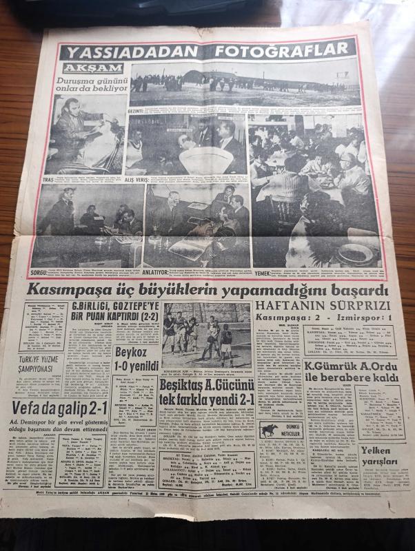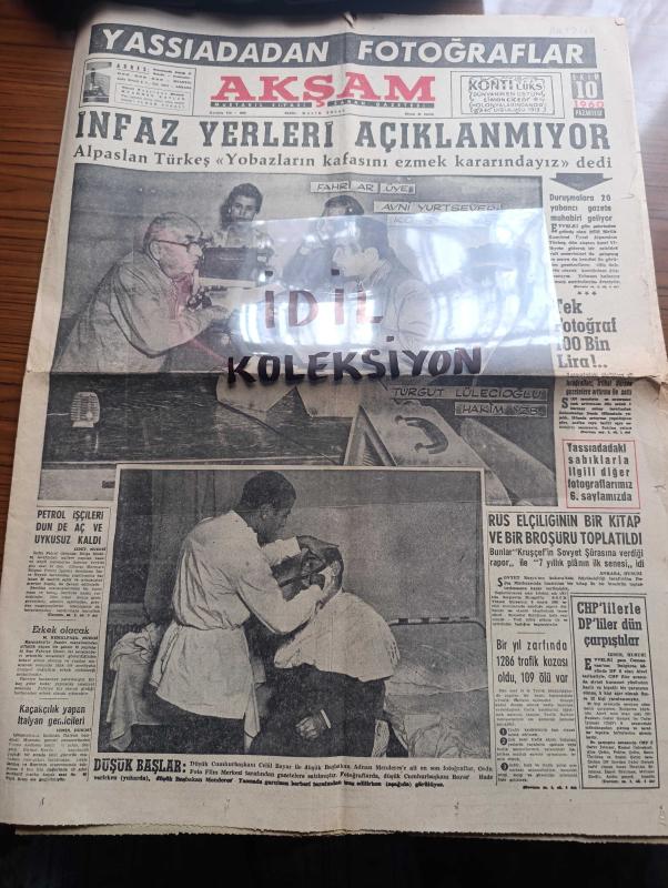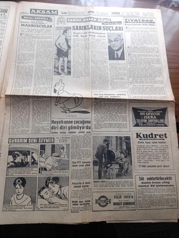 Akşam Gazetesi - Turkish Newspaper - 10 Ekim 1960 - Yassıada'dan Fotoğraflar - İnfaz Yerleri Açıklanmıyor - Alparslan Türkeş Yobazların Kafasını Ezmek Kararındayız Dedi - Düşük Cumhurbaşkanı Celal Bayar İle Düşük Başbakanı Adnan Menderes'e Ait En Son Fotoğraflar - Yassıadadaki Düşüklere Ait Fotoğrafları İrtibat Bürosu Gazetelere Arttırma İle Sattı - Kızkulesi Kahramanı Çizen Suat Yalaz - Köpek Ve Cumhurbaşkanı Yazan Müşerref Hekimoğlu Köşe Yazısı - Öğrenci Dertleri İçin Bir Büro Kuruldu - Burası Amerika Seyhan Bilbaşar Yazı Dizisi - Günahım Seni Sevmek Aşk Ve His Romanı Resimleyen Remzi - İlk Gün Sabık Cumhurbaşkanı Celal Bayar Hesap Verecek - Geyşa'nın Hatıra Defteri Yazan Kimiko Omura Yazı Dizisi - Bize Barbaroslu Derler Yazan Çizen Ratip Tahir Burak - Nazlı İle Hamza Karikatür - Yaralı Gönül Çizgi Roman - İstanbul Ankara Radyosu Programı - Düşük Bakanlardan Samet Ağaoğlu Yassıada'nın Asker Berberinde Traş Oluyor fotoğraf - Beşiktaş Ankaragücünü Tek Farkla Yendi - Karagümrük Takımı adlı eser, Kitap > Süreli Yayınlar > Gazeteler > Türkiye > Genel > Günlük kategorisinde İkinci El olarak satıştadır.
