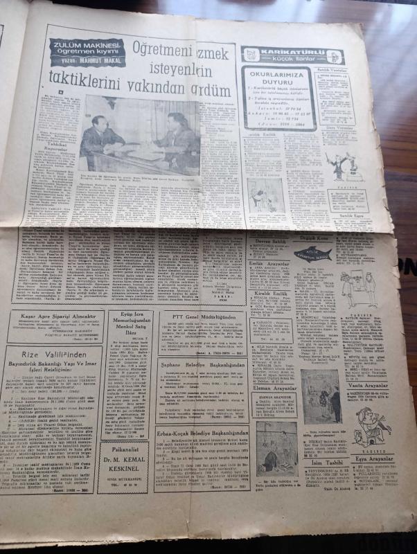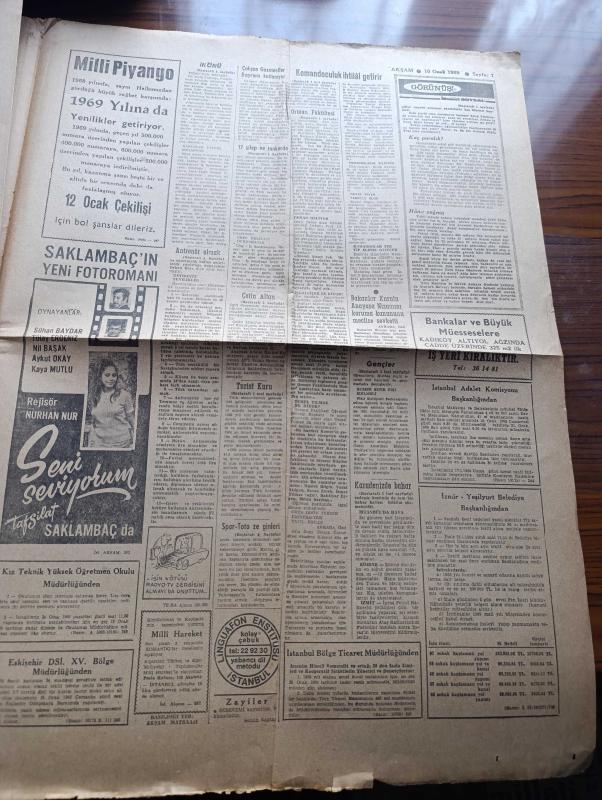 Akşam Gazetesi - Turkish Newspaper - 10 Ocak 1969 - anayasayı koruma tasarısı meclise verildi - komandoculuk ihtilal getirir - İsmet İnönü fikirler zorla ve saldırı ile yürütülemez - Ortadoğu Teknik Üniversitesi tatil oldu orman fakültesi yurdu işgal edildi - Deniz Ulaş İş sendikası tarafından alınan grev kararı uygulanmaya başladı Fotoğrafı - Yılın en başarılı sanatçıları - en iyi oyun yazarı Melih Cevdet Anday Fotoğrafı - en iyi erkek oyuncu Münir Özkul Fotoğrafı - 1967 1968 tiyatro sezonunun en iyi kadın oyuncusu seçilen Nisa Serezli Fotoğrafı - en iyi rejisör Sermet Çağan Fotoğrafı - üniversitede öğrenciler yönetime katılacak - Türkiye'de eğitim sorunu ve sosyalizm yazan Çetin Altan - Üç hilalli komandolar yazan Altan Öymen - işte kıyılan 2 öğretmen bir arada Birisi TÖS'ün eski genel başkanı Feyzullah Ertuğrul öteki yazarımız Mahmut Makal - Türkan Şoray'ın fiyatı tepki yarattı Fotoğrafı - Avni Anıl film müziğine başladı Fotoğrafı - Ogün Altıparmak futbolu bırakacağım dedi fotoğraf adlı eser, Kitap > Süreli Yayınlar > Gazeteler > Türkiye > Genel > Günlük kategorisinde İkinci El olarak satıştadır.