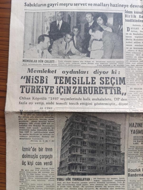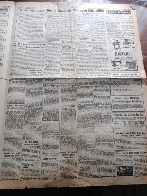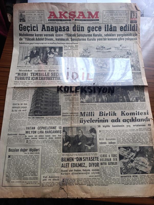 Akşam Gazetesi - Turkish Newspaper - 13 Haziran 1960 - geçici anayasa dün gece ilan edildi - muhakeme kararı vermek üzere yüksek soruşturma kurulu sabıkları yargılamak için de Yüksek Adalet divanı kurulacak - idam kararları milli birlik komitesinin tasdikinden geçecek - memleket aydınları diyor ki nispi temsille seçim Türkiye için zarurettir - Vatan cephelerine 15 milyon lira harcanmış - hazine'ye alyans yağmuru arttı - milli birlik komitesinin üyelerinin adı açıklandı - Cemal Madanoğlu - 27 Mayıs inkılabının sevinci denizde ve karada kutlandı Fotoğraflar - Diyanet İşleri Başkanı Ömer Nasuhi Bilmen din siyasete alet edilmez diyor - üniversitede miting - milli birlik komitesi başkanı Cemal Gürsel - İstanbul'da bugün bu gece sinema programı - kız kulesi kahramanı yazan A. Ziya Kozanoğlu çizen Suat Yalaz - Florya dinlenme evleri için bugün kura çekiliyor - Fenerbahçe Beşiktaş'ı Ankara'da 1-0 yendi fotoğraflar - Beşiktaş maçtan evvel şampiyonluk kupası ile Şeref turu attı Fotoğrafı adlı eser, Kitap > Süreli Yayınlar > Gazeteler > Türkiye > Genel > Günlük kategorisinde İkinci El olarak satıştadır.