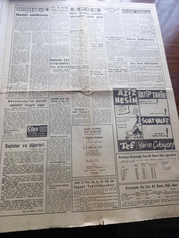 Akşam Gazetesi - Turkish Newspaper - 20 Haziran 1960 - soruşturma kurulu bugün ilan ediliyor - Suçlular ve diğerleri yazan Doçent Doktor Edip F. Çelik Başmakale - bakanlar kurulu tarafından tespit edilen liste Milli Birlik komitesine verildi - Galatasaray mezunları pilav günü fotoğraf - Sarıyer'deki esrarlı trafik kazasında iki genç öldü - Ödemiş şilebinde 100 kilo Afyon ele geçirildi - Adnan Menderes'e 60 bin dolarlık döviz nasıl gönderilmiş - Atatürk köşkü depo yapılmış - Güvenevler'in dertli sakinleri kongre yaptı fotoğraf - Sabıklar 155 bin liralık kumaşı parasız almış - Kız kulesi kahramanı yazan Abdullah Ziya Kozanoğlu Çizen Suat Yalaz - Dördüncü Murad siyah Zambak yazan Suzan Sözen Yazı Dizisi - Sabıklar mikro teyple emirleri tespit etmişler - radyoda köy programları yer alacak - Aziz Nesin Ratip Tahir Ve Suat Yalaz TEF Yarın çıkıyor - olimpiyatlara katılacak olan 119 kişilik kafile 70 kişiye indiriliyor - Beşiktaş Karagümrük karşısında terledi 0 0 fotoğraf - Nur Ökten adlı eser, Kitap > Süreli Yayınlar > Gazeteler > Türkiye > Genel > Günlük kategorisinde İkinci El olarak satıştadır.