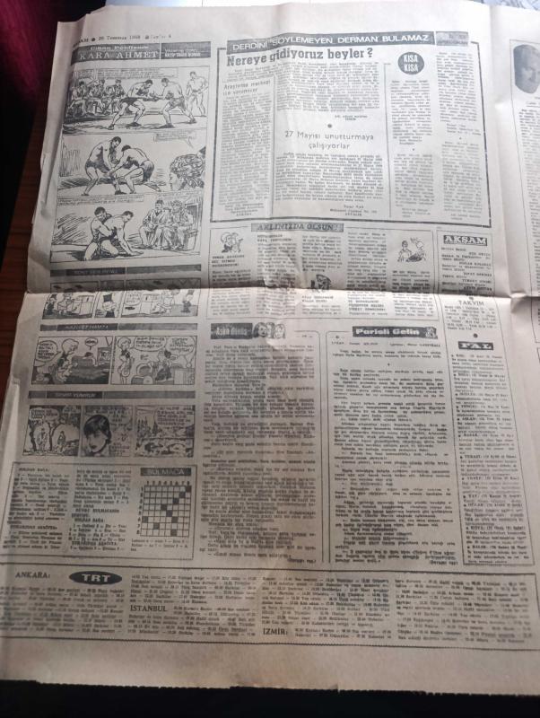 Akşam Gazetesi - Turkish Newspaper - 26 temmuz 1968 - Asker bir ara polisle çatıştı gösteri savaş halini aldı - görevli albay Cağaloğlu meydanında toplum polis müdürü Yaşar Okçuoğlu ile tartışıyorlar fotoğraf - üniversiteli gençler TMTF'nin önünde toplum polisini önüne katarak kovalamış Fotoğrafı - İstanbul kız lisesi önünde toplanan üniversiteliler toplum polisini taş yağmuruna tutmuşlar fotoğraf - Faruk Sükan'ın odasına Bursa nutkundan pasajlar ihtiva eden pankart bırakıldı Fotoğrafı - cenazesi Taşkent'e götürülen Vedat Demircioğlu gömüldü - yürüyüşçü gençlerin altı aya kadar hapsi isteniyor - karaoğlan'ın maceraları yazan ve çizen Suat Yalaz - Taş yazan Çetin Altan - Ferdi Tayfur için Orhan Boran radyoda hocamdı derdi yazan Cahit Irgat - Ajda Pekkan Ve Leyla Sayar fotoğraf - beyaz perdeye yeni Ayşecik bulundu Funda Gürçen fotoğraf - Atlı karınca filmi Belgin Doruk İzzet Günay fotoğraf - bu hafta çok sevilen 5 şarkı - Fenerbahçe bu yıl ne yapabilir - Zafer Beşiktaş'ın olacaktır, Nur Ökten tarafından kaleme alınmıştır. Akşam Gazetesi - Turkish Newspaper - 26 temmuz 1968 - Asker bir ara polisle çatıştı gösteri savaş halini aldı - görevli albay Cağaloğlu meydanında toplum polis müdürü Yaşar Okçuoğlu ile tartışıyorlar fotoğraf - üniversiteli gençler TMTF'nin önünde toplum polisini önüne katarak kovalamış Fotoğrafı - İstanbul kız lisesi önünde toplanan üniversiteliler toplum polisini taş yağmuruna tutmuşlar fotoğraf - Faruk Sükan'ın odasına Bursa nutkundan pasajlar ihtiva eden pankart bırakıldı Fotoğrafı - cenazesi Taşkent'e götürülen Vedat Demircioğlu gömüldü - yürüyüşçü gençlerin altı aya kadar hapsi isteniyor - karaoğlan'ın maceraları yazan ve çizen Suat Yalaz - Taş yazan Çetin Altan - Ferdi Tayfur için Orhan Boran radyoda hocamdı derdi yazan Cahit Irgat - Ajda Pekkan Ve Leyla Sayar fotoğraf - beyaz perdeye yeni Ayşecik bulundu Funda Gürçen fotoğraf - Atlı karınca filmi Belgin Doruk İzzet Günay fotoğraf - bu hafta çok sevilen 5 şarkı - Fenerbahçe bu yıl ne yapabilir - Zafer Beşiktaş'ın olacaktır adlı eser Türkçe dilindedir.