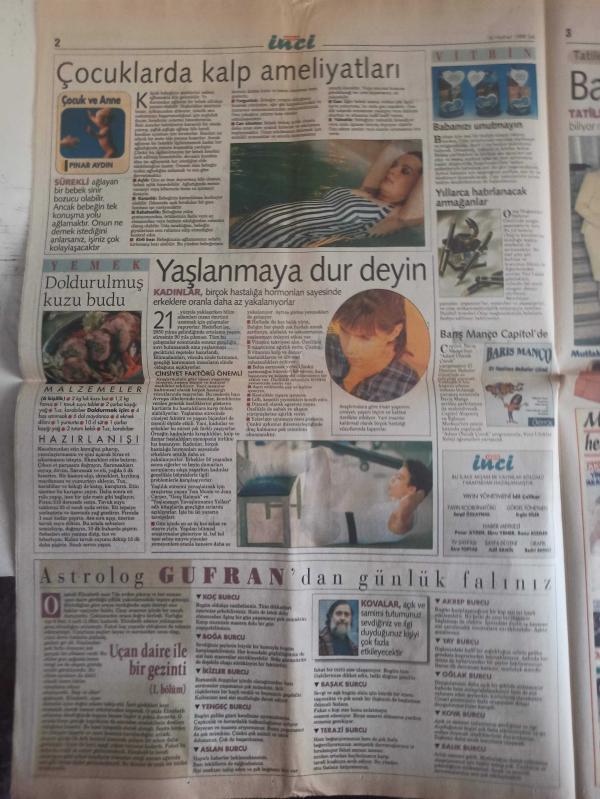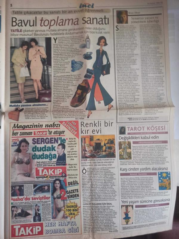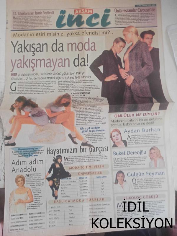 Akşam İnci Magazin Gazetesi - 16 Haziran 1998 - 12. Uluslararası İzmir Festivali - Ünlü Ressamlar Carousel'de - Yakışan da Moda Yakışmayan da! - Kendi Kimliğinizi Oluşturan - Adım Adım Anadolu - Muazzez Ersoy - Hayatımızın Bir Parçası - Ünlüler Ne Diyor? - Aydan Burhan - Buket Dereoğlu - Gülgün Feyman - Psikolog Görüşü - Çocuk ve Anne - Pınar Aydın - Çocuklarda Kalp Ameliyatları - Doldurulmuş Kuzu Budu - Yaşlanmaya Dur Deyin - Cinsiyet Faktörü Önemli - Babanızı Unutmayın - Yıllarca Hatırlanacak Armağanlar - Barış Manço Capitol'de - Astrolog Gufran'dan Günlük Falınız - Uçan Daire ile Bir Gezinti - Bavul Toplama Sanatı - Birsen Altıner - Senaryo Yazarı ve Yönetmen İşbirliği - Renkli Bir Kır Evi - Tarot Köşesi - Değişiklikleri Kabul Edin - Karşı Cinsten Yardım Alacaksınız - Yeni Yaşam Sürecine Gireceksiniz - Rahmetli Babam - Uyanık Huysuz - Savaş Kalafat - Tatlı Kaçıklar'ın Serüvenleri - Zorluklara Direniş - Sibel'de Son Perde - Rahmetli Babam - Marco Polo - Çalınmış Güzellik fotoğraf ve haberi - Tam Takım Gazete Yıpranma, sararmalar, kupon kesiği ve yırtılmalar zamana bağlı olarak görülebilir