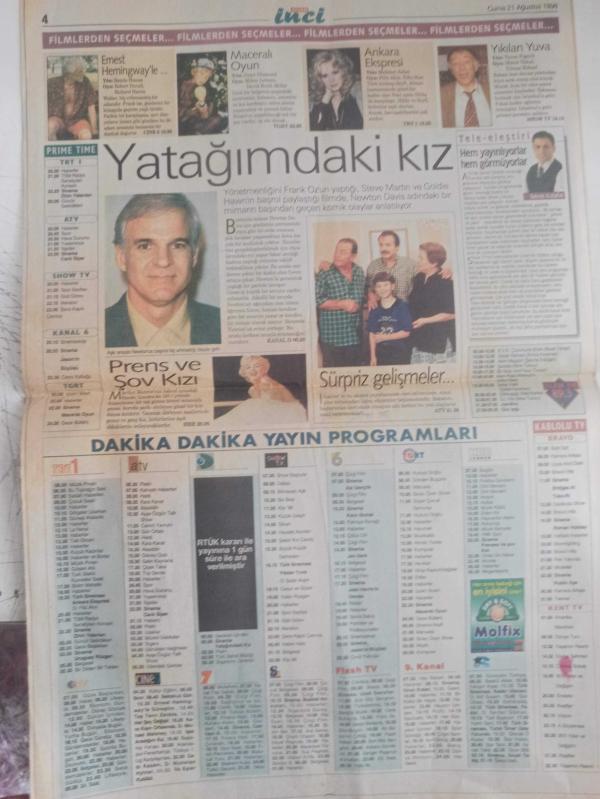 Akşam İnci Magazin Gazetesi - 21 Ağustos 1998 - Burdur'da Kültür Sanat Şenliği - Anadolu'ya Müzik Şöleni - Gardırobunuzu Garantiye Alın - Black İce - Doğru Temizleme Yapın - Burayı Dikkatli Okuyun - Çocuğunuza Zaman Ayırın - Pınar Aydın - Tarot Köşesi - Yeni İmkanları Değerlendirin - Fırında Defneli Sardalya - Lazerle Diş Tedavisi - Atılımlarınız Başarılı Olacak - Sihirli Kılıç'ın Sihri - Coşkun Çokyiğit - Özen'in Atağı - Yatağımdaki Kız - Savaş Kalafat - Prens ve Şov Kızı - Sürpriz Gelişmeler - Yıkılan Yuva - Ankara Ekspresi - Maceralı Oyun - Ernest Hemingway fotoğraf ve haberi - Tam Takım Gazete Yıpranma, sararmalar, kupon kesiği ve yırtılmalar zamana bağlı olarak görülebilir