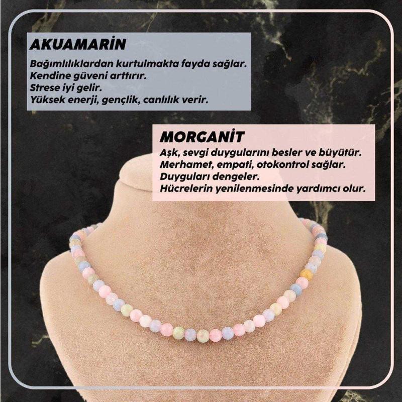 Akuamarin - Morganit Doğal Taşı Kolye - 6 mm Taşların faydaları: Akuamarin: Rahatlama taşıdır. Solunum yolu rahatsızlıklarına iyi gelir. Kendine güveni arttırır. Strese iyi gelir. Morganit: Merhamet,empati,otokontrol sağlar. Duyguları dengeler. Hücrelerin yenilenmesinde yardımcı olur.