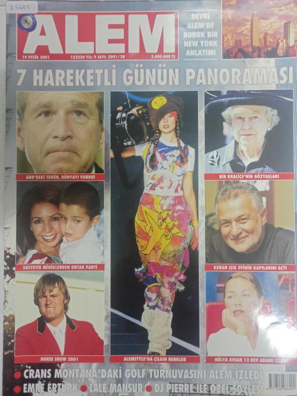 Alem Magazin Dergisi - 19 Eylül 2001 - Kenan Işık - Hülya Avşar - Semra Özal - Güllü Aybar - Demet Şener - Kaya Çilingiroğlu - Hülya Avşar - Ali Koç - Yonca Evcimik - Meltem Cumbul - Murat Dedeman - Sedat Aloğlu - Esra Çavuşoğlu - Rahmi Koç - Levent Kırca - Süleyman Demirel - Faruk Saraç - İzzet Yıldızhan - Çolpan İlhan - Kerem Alışık - Çağla Şikel - Deniz Akkaya - Deniz Malkoç - Gülay Kamaz - Pınar Tezcan - Ayşe Erdem - Aslışah Alkoçlar - Fulya Eyilik - Neşe Erberk - Çağla Şikel - Sakıp Sabancı - Ayşe Tatari - Emre Ertürk - Lale Mansur - Cemil İpekçi - Bulmaca Sayfası - Haberleri ve fotoğrafları - Tam takım dergi- adlı eser Türkçe dilindedir.