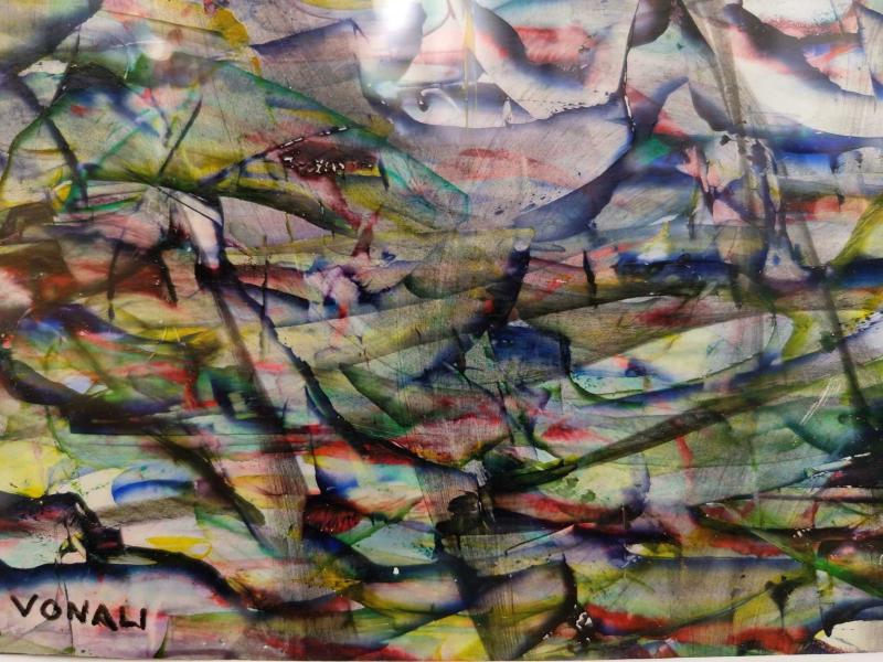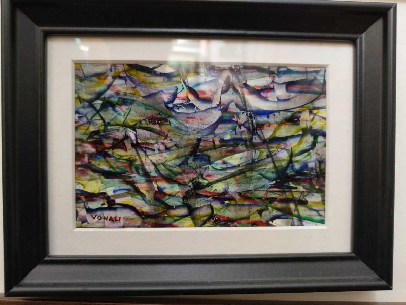 Ali Bertan Vonalı imzalı, kağıt üzerine (kartona marufle) yağlıboya soyut tablo. İç ölçüler 9x13 cm, çerçeveli ölçüsü 20x15 cm.