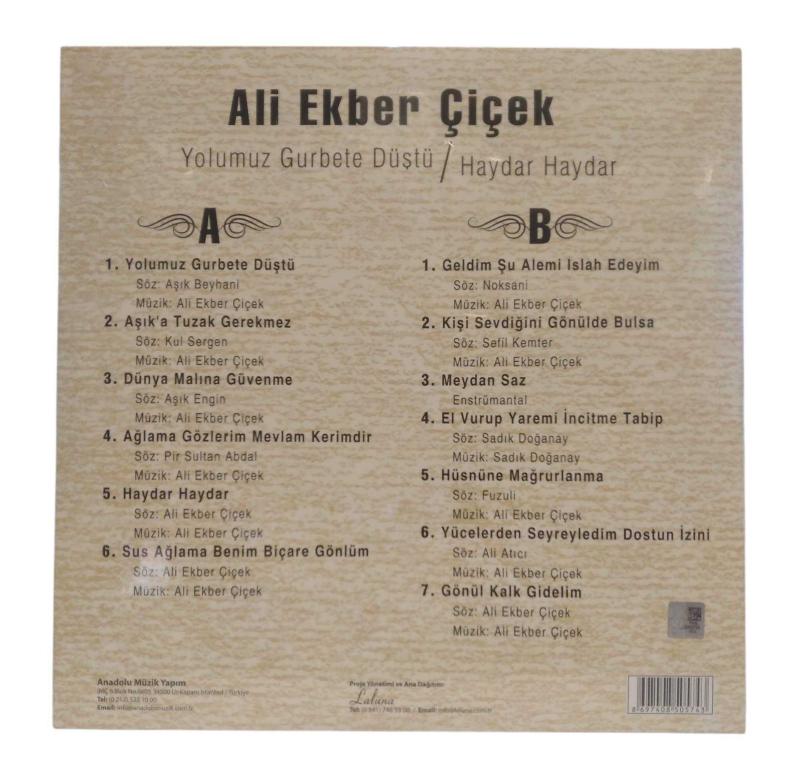 Ali Ekber Çiçek - Yolumuz Gurbete Düştü/Haydar Haydar Anadolu Müzik Lp Bandrollü ve Orjinal Kapalı Ambalajında Kullanılmamış Yeni Basım Üründür Yayınlanma Tarihi : 05.01.2017 LP-1-A 1. Yolumuz Gurbete Düştü 2. Aşık'a Tuzak Gerekmez 3. Dünya Malına Güvenme 4. Ağlama Gözlerim Mevlam Kerimdir 5. Haydar Haydar 6. Sus Ağlama Benim Biçare Gönlüm LP-1-B 1. Geldim Şu Alemi Islah Edeyim 2. Kişi Sevdiğini Gönülde Bulsa 3. Meydan Saz 4. El Vurup Yaremi İncitme Tabip 5. Hüsnüne Mağrurlanma 6. Yücelerden Seyreyledim Dostunu İzini 7. Gönül Kalk Gidelim