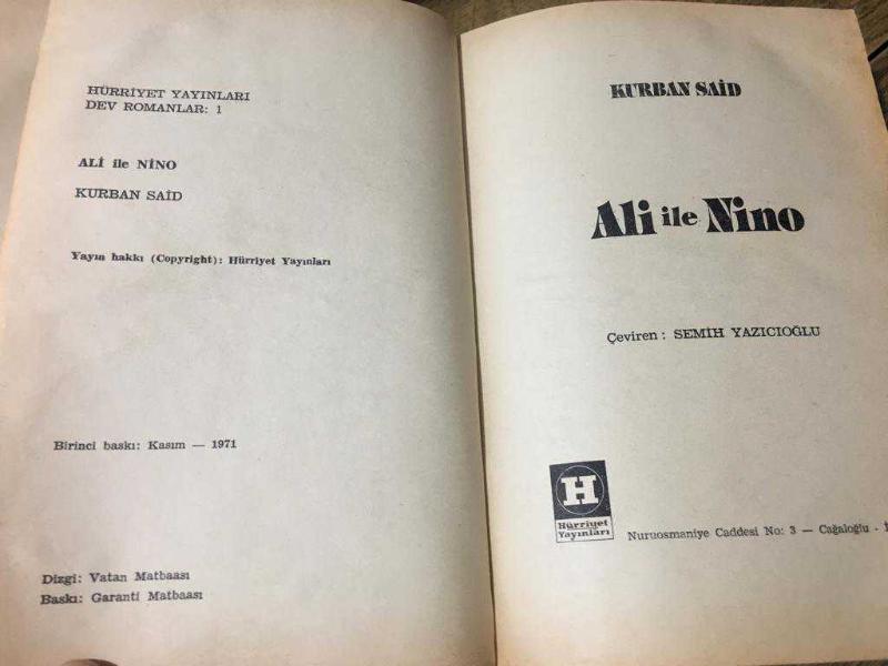 Ali ile Nino, Kurban Said tarafından kaleme alınmıştır. Kitap 1971 yılında Hürriyet Yayınları tarafından yayınlanmıştır. Bu baskının çevirisi Semih Yazıcıoğlu tarafından yapılmıştır. 348 sayfadır. Ali ile Nino adlı eser Türkçe dilindedir.